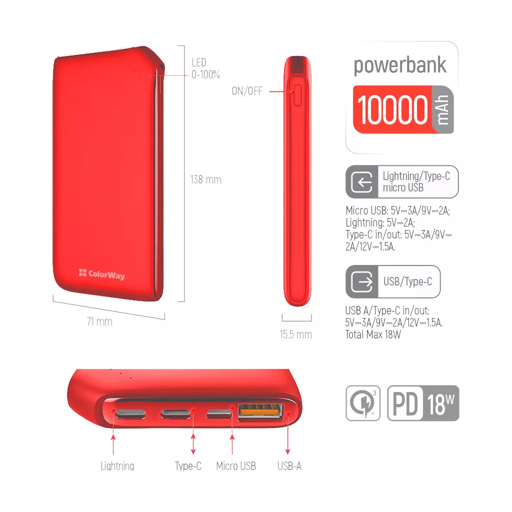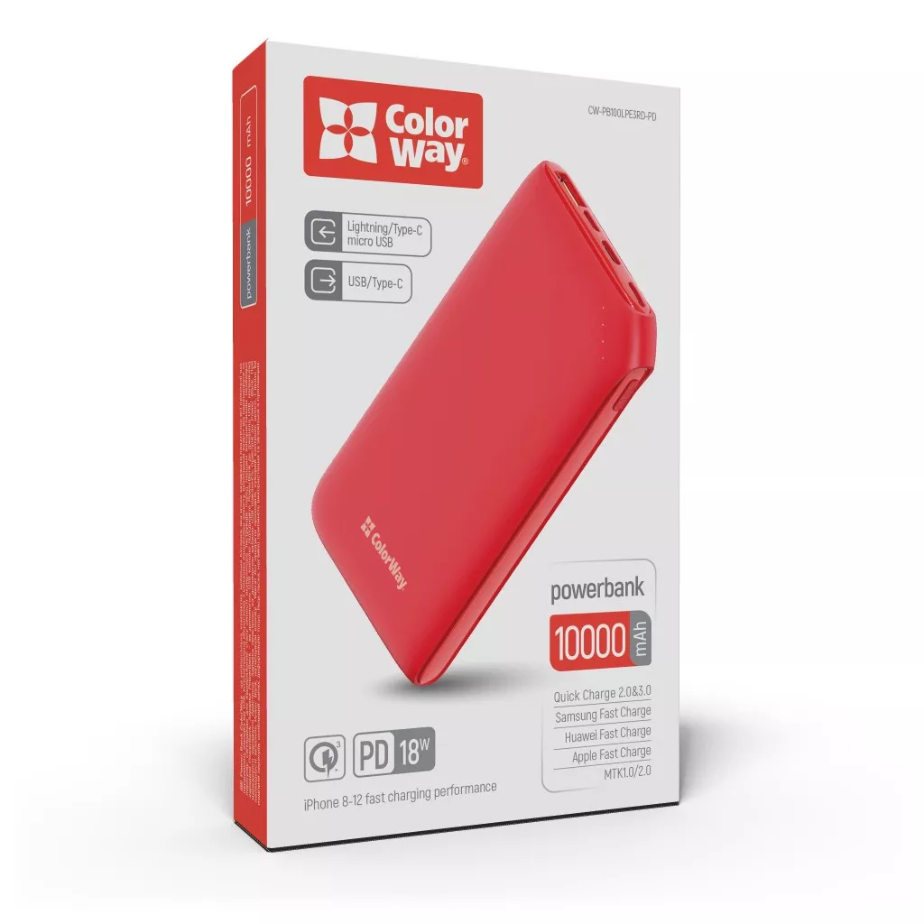 Портативное зарядное устройство ColorWay с мощным аккумулятором и поддержкой технологии быстрой зарядки Quick Charge 3.0 и Power Delivery мощностью 18W, что позволит зарядить устройство в кратчайший промежуток времени. Имеет несколько уровней защиты от короткого замыкания и перепадов напряжений. Это гарантирует безопасность, и исключает вероятность повреждения мобильного устройства и самого Power Bank.
