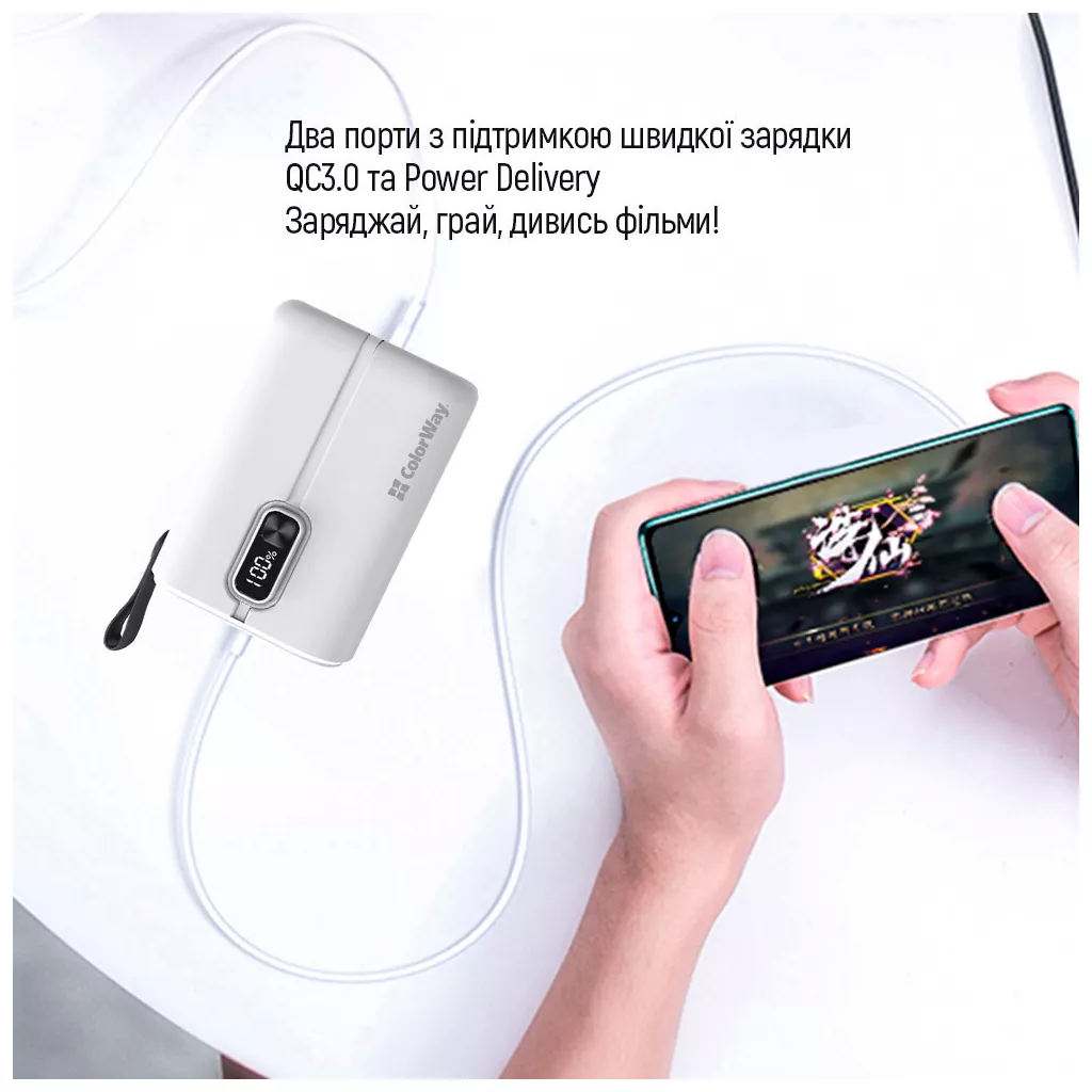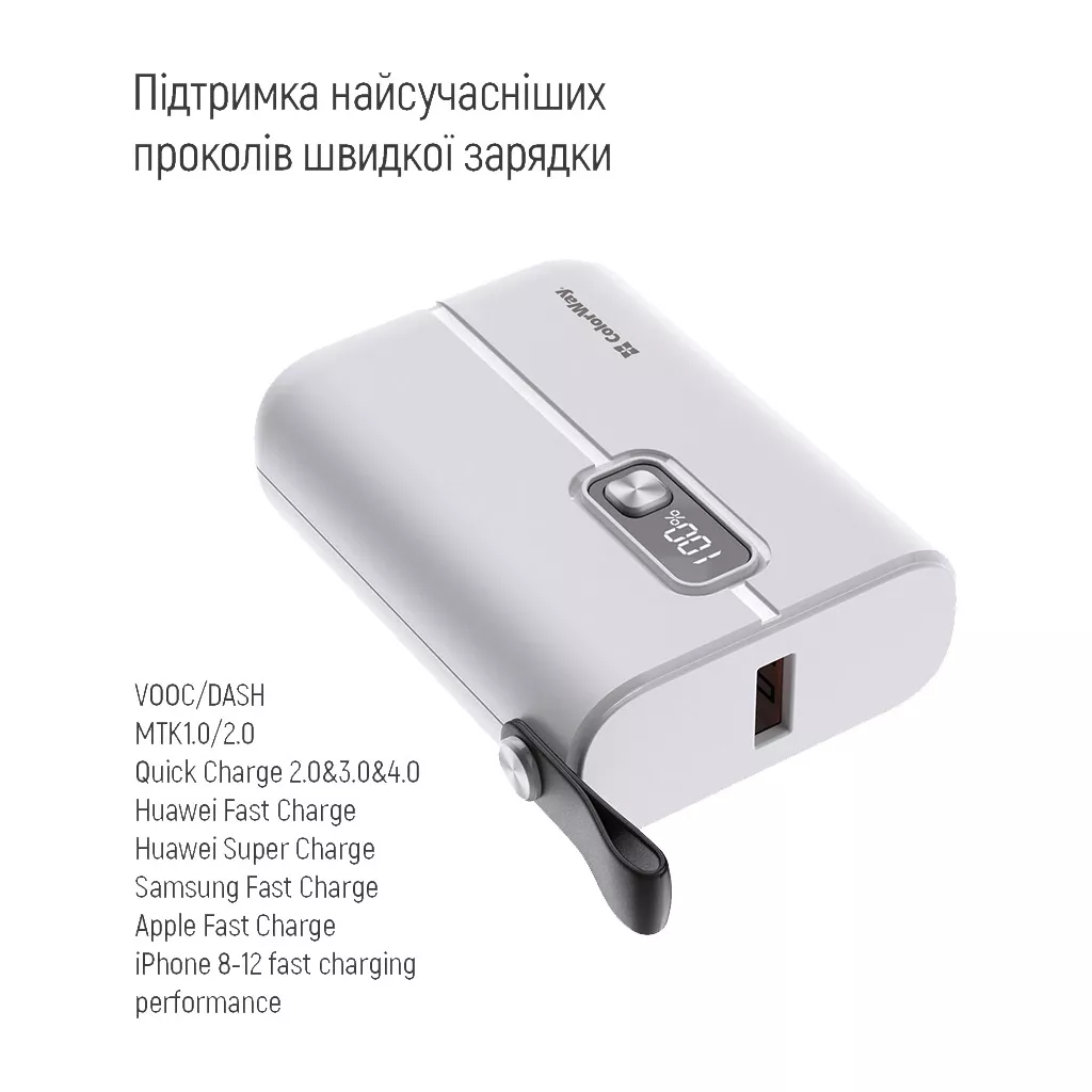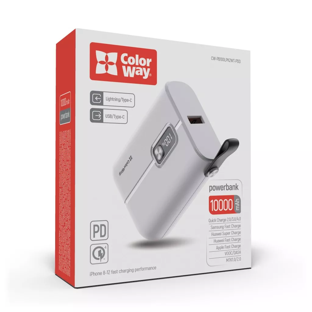 Компактный и функциональный УМБ ColorWay идеально подойдет для путешествий и практически не занимает место в сумке. Высокоемкий аккумулятор 21700 Lithium Battery более компактен и эффективен по сравнению со стандартными УМБ, с большой отдачей до 22.5Вт. Поддерживает практически все современные протоколы зарядки такие как: (VOOC/DASH, MTK1.0/2.0, Power Delivery 3.0, Quick Charge 2.0 & 3.0 & 4.0, Huawei Fast Charge, Huawei Super Charge, Samsung Fast Charge, Apple Fast Charge) , что позволит с максимально и в полном объеме скорости заряжать Ваши устройства. Возможность быстрой зарядки не только смартфона, но и самого Powerbank по lightning и Type-C – достаточно иметь всего лишь один кабель! оснащен и укомплектован LED-индикатором, благодаря которому Вы сможете контролировать уровень заряда, а емкости в 10000 мАч вполне хватит для удовлетворения потребностей в зарядке вашего гаджета. Идеальный аксессуар, который подойдет к любому устройству.