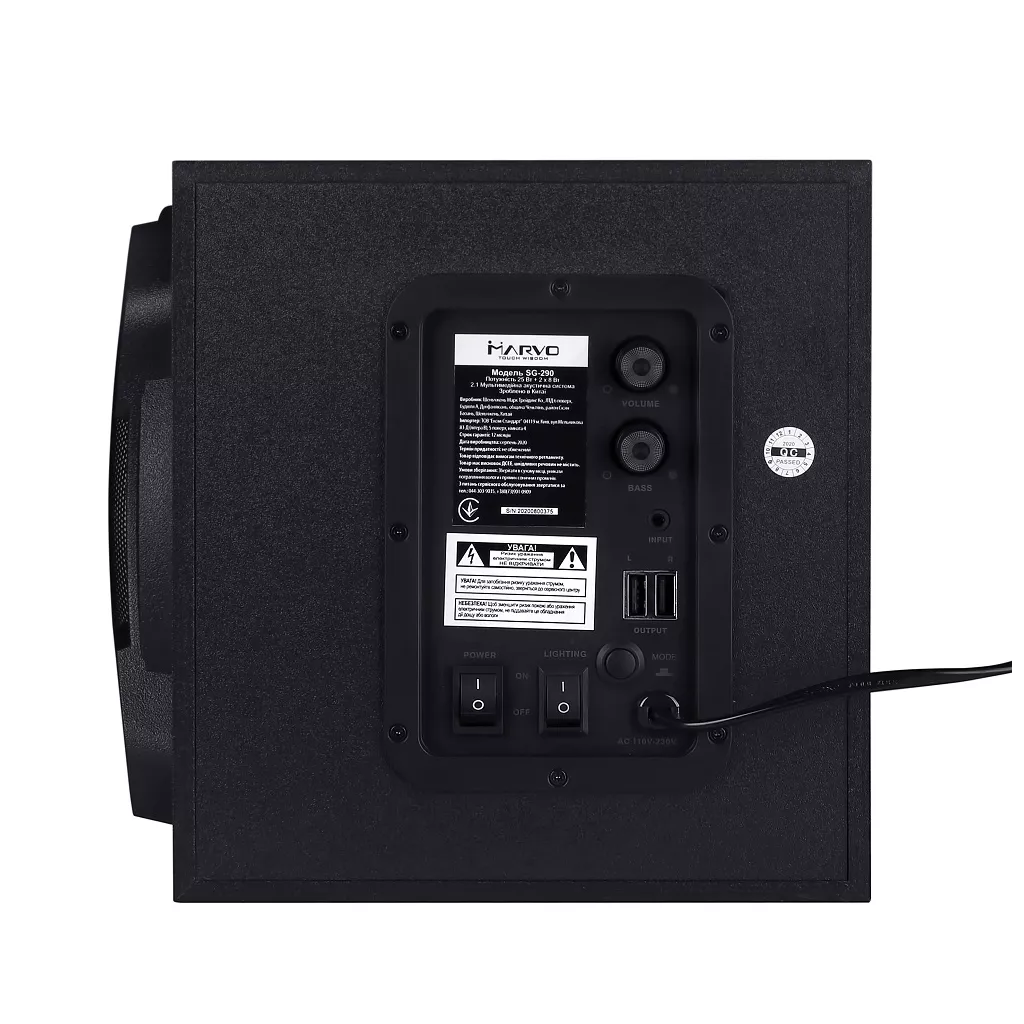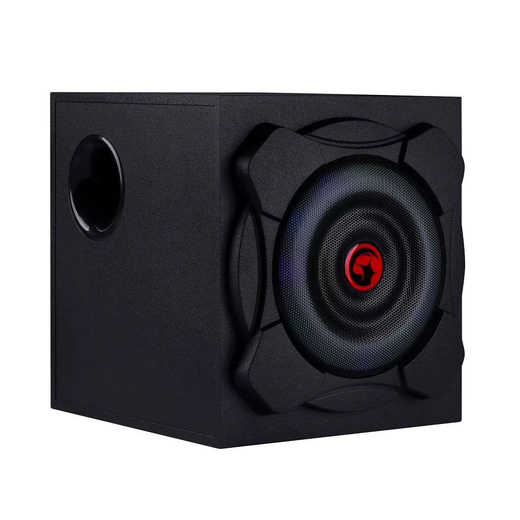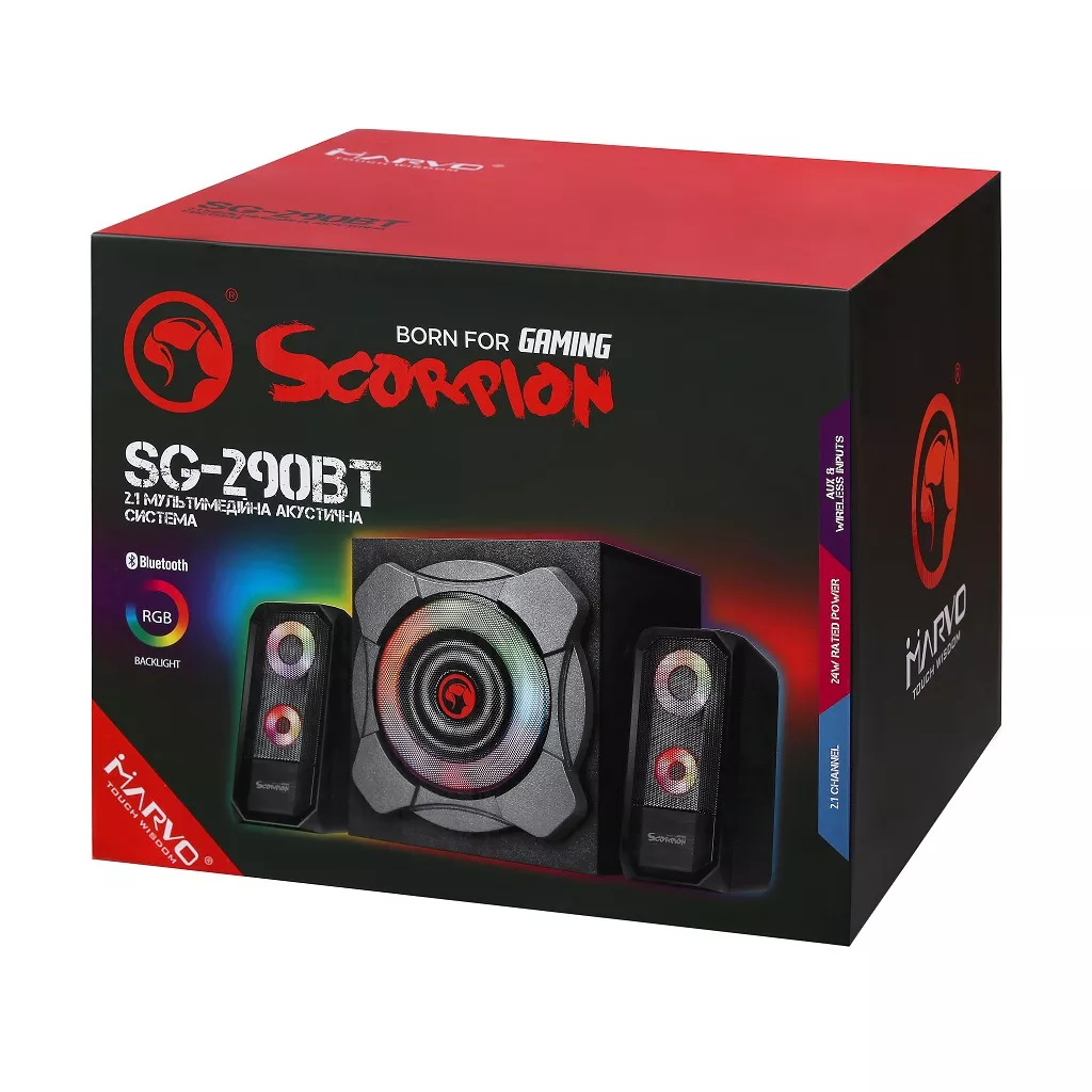 Настольная акустическая система 2.1 MARVO SG-290 BT c LED подсветкой. Общая мощность 41 Вт. Музыка дополняется световым шоу благодаря RGB подсветке на сабвуфере и сателлитах. Корпус выполнен из качественной древесины для более глубочайшего и насыщенного звучания. Подключай музыку со смартфона или планшета по Bluetooth. Также можно воспроизводить музыку через аудио-кабель (вход AUX). Создайте особую атмосферу для просмотра фильмов, игр, прослушивания музыки. Особенности: