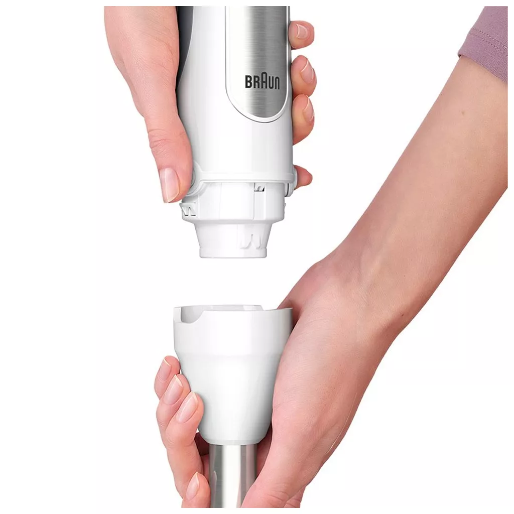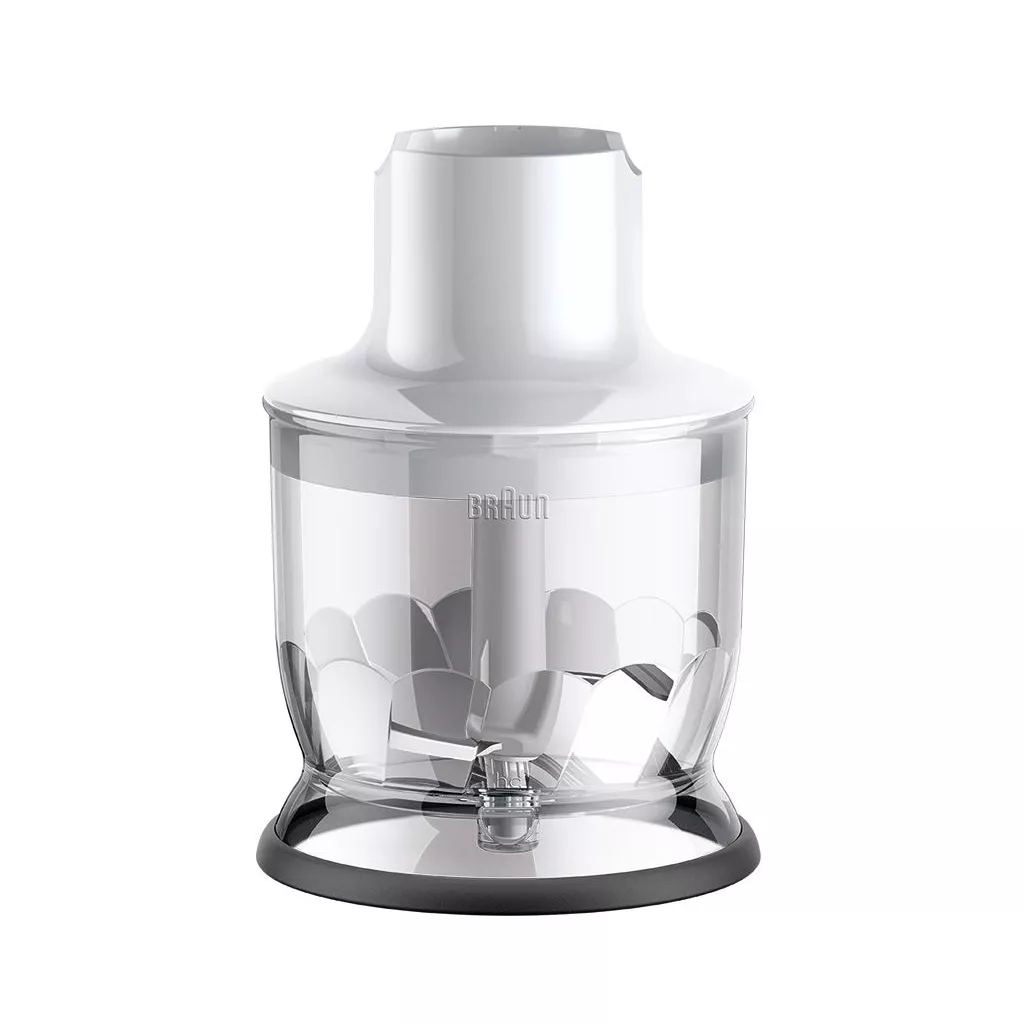 Глядя на погружной блендер Braun MQ 7020 WH сразу, невозможно предусмотреть, какой функционал и высокая производительность имеет данный прибор, однако, воспользовавшись им однажды, вы больше не захотите с ним разводиться. Этот блендер продуман до мелочей, чтобы его использование было в одно удовольствие. Корпус Корпус выполнен из прочного пластика, который не нагревается и удобно лежит в руке. Цвет прибора – белый, с серыми вставками, гармонично дополняющими дизайн прибора. Моторный блок блендера обладает мощностью целых 1000 Вт, что говорит о его высокой производительности. Также стоит отметить легкость смены насадки благодаря системе EasyClick Plus. Управлять этим блендером очень просто, ведь в нем находится технология SmartSpeed. Сверху корпуса находится удобная кнопка, благодаря которой вы самостоятельно регулируете скорость моторного блока, просто нажав на нее сильнее или мягче. практическую комплектацию, которой достаточно для закрытия основных запросов процессов на кухне. Блендерная ножка, выполненная из нержавеющей стали, отлично сможет сделать суп-пюре или какой-нибудь соус. К тому же, благодаря уникальной форме можете быть спокойны за чистоту поверхности, где используется прибор. Купол уникальной формы защищает от брызг во время работы. Также, в комплектации имеется измельчитель объемом на 350 мл, венчик и мерный стакан со шкалой, объемом в 600 мл.