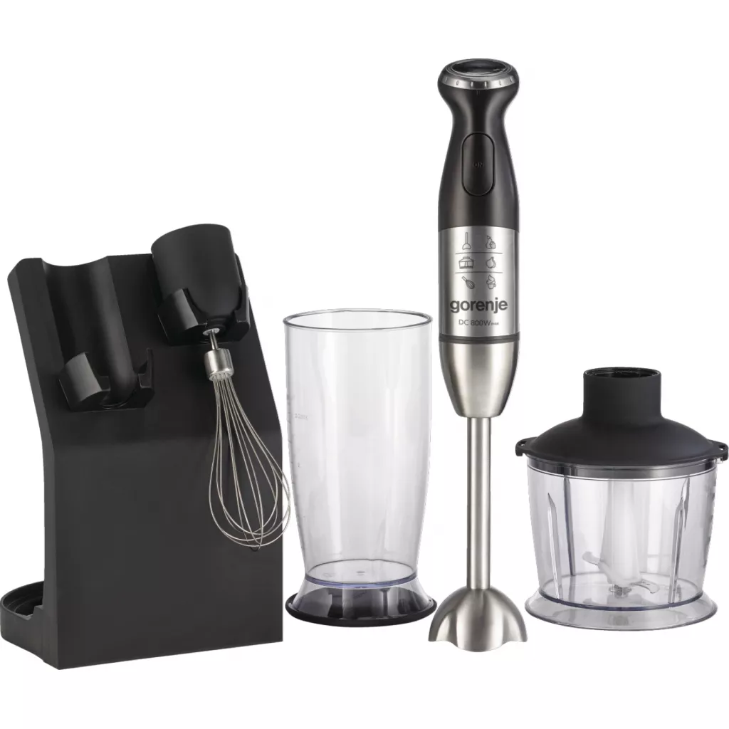 Расширенная комплектация блендера Gorenje HBC807QB включает непосредственно блендер с металлической ногой, мерный стакан, мини-измельчитель с чашей, насадку для сбивания (венчик), а также оригинальную подставку, на которой можно хранить аксессуары.