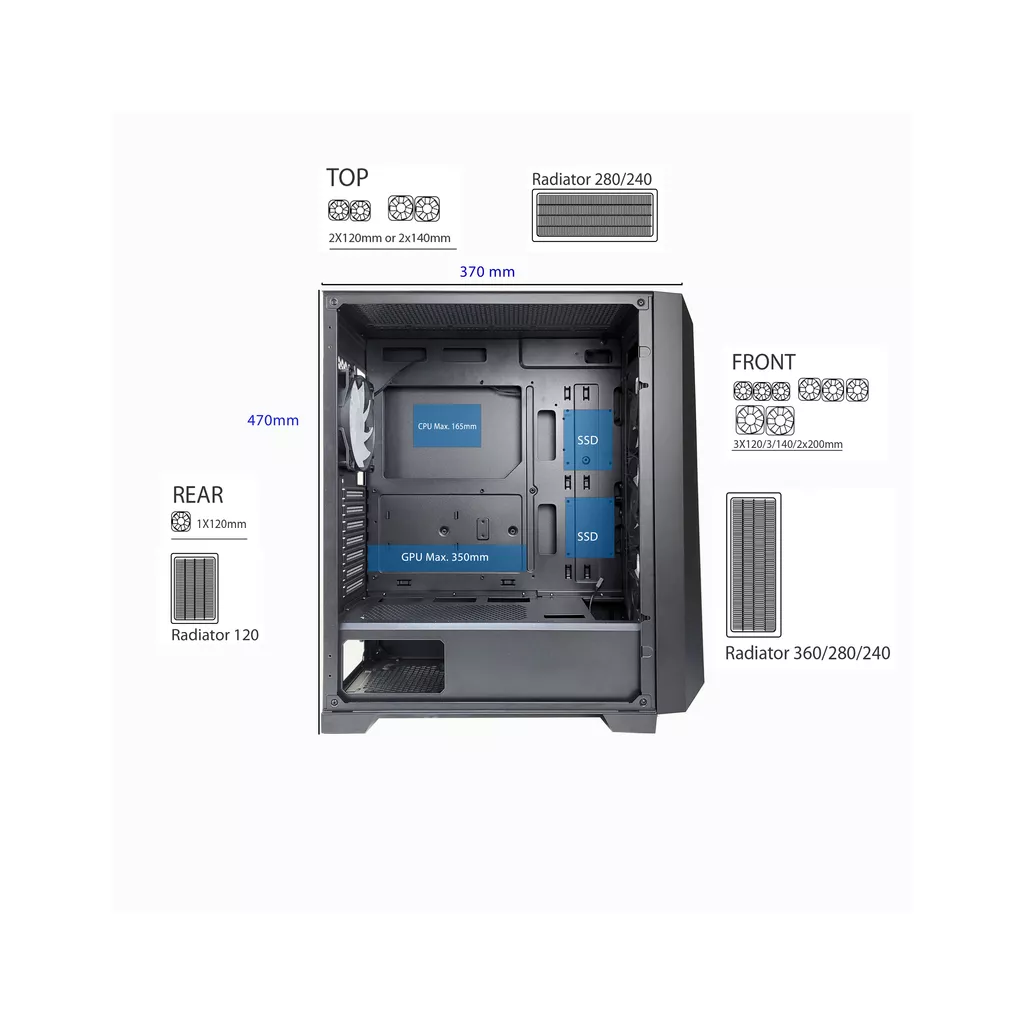 Корпус Xilence Xilent Breeze черного цвета отлично подойдет для высокопроизводительных игровых систем. Он отличается современным динамическим дизайном и предлагает множество вариантов для построения эффективной охлаждающей системы. В передней части корпуса Xilence Xilent Breeze можно установить жидкостные охладители с радиаторами размером 360, 280 и 240 мм, а в верхней и задней части его предусмотрено место для радиаторов размером 280, 240 или 120 мм. процессорных кулеров высотой 165 см. Кроме того, для обеспечения лучшей циркуляции воздуха в корпусе монтажное место для блока питания предусмотрено снизу. Передняя сетчатая ромбовидная панель корпуса улучшает воздушный поток и придает дизайн оригинальности. Вместе с боковой панелью, изготовленной из закаленного стекла, она открывает отличный обзор установленной системы. Ваши игры будут еще более динамичными вместе с ARGВ-подсветкой вентиляторов.