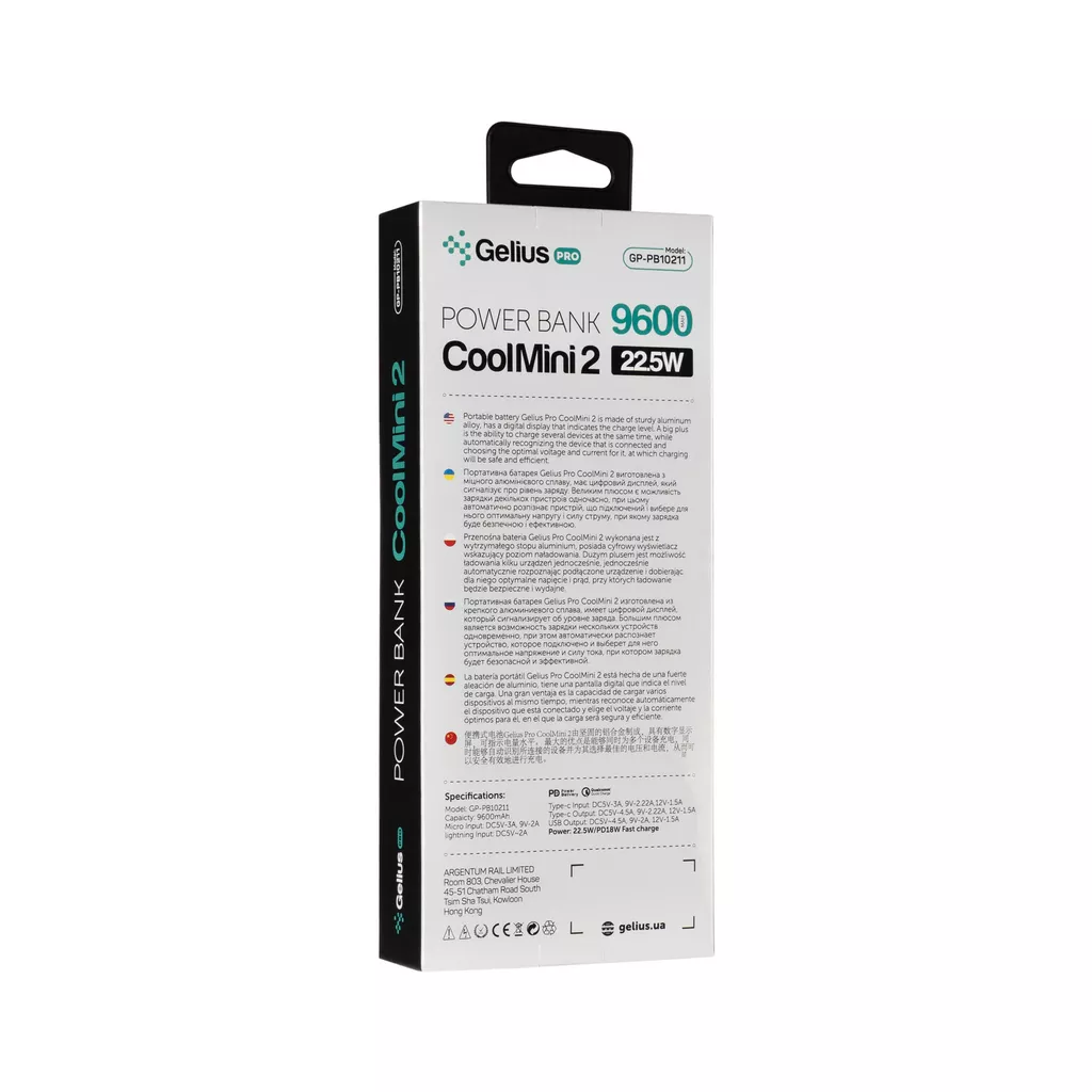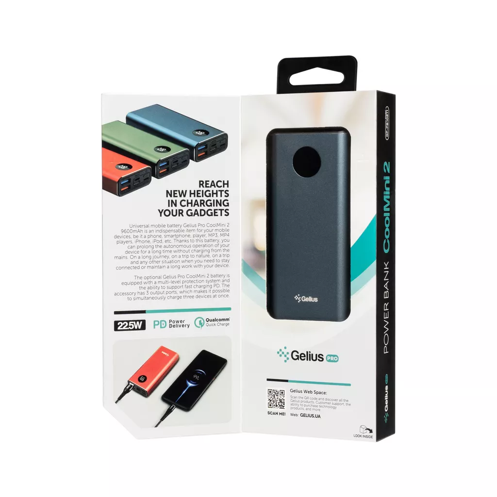 Универсальная мобильная батарея Gelius Pro CoolMini 2 9600mAh – незаменимая вещь для ваших мобильных устройств, телефон, смартфон, плеер, MP3, MP4 плееры, iPhone, iPod и т.д. Благодаря этой батарее, вы сможете надолго продлить автономную работу устройства без зарядки от сети. В дальней дороге, поездке на природу, путешествии и любой другой ситуации, когда вам необходимо оставаться на связи или поддерживать длительную работу с устройством. Портативная батарея Gelius Pro CoolMini 2 изготовлена из прочного алюминиевого сплава, имеет информативный цифровой дисплей, сигнализирующий об уровне заряда. Большим плюсом является возможность зарядки нескольких устройств одновременно. Внешний аккумулятор автоматически распознает устройство, подключенное и выбирающее для него оптимальную силу тока, при котором зарядка будет безопасной и эффективной. Дополнительная батарея Gelius Pro CoolMini 2 оснащена и укомплектована многоуровневой системой защиты и возможностью поддержания быстрой подзарядки PD 4.0. Аксессуар имеет 3 выходных порта, что дает возможность одновременно заряжать сразу три девайса. Характеристики: Емкость: 96000mAh Тип аккумулятора: Li-ion (Matsushita Establishes Mass-Production System) Подключение устройств: 2хUSB и 1xUSB Type-C Вход зарядки батареи: MicroUSB/USB Type-C Ток заряда 1-го USB порта: 5V/ -2A, 12V-1.5A, 22.5W Ток заряда 2-го USB порта: 5V/3A, 9V/2A, 12V-1.5A, 22.5W Ток заряда Type-C разъема: 5V/3A(PD), 9V / 2A(PD), 12V/1.5A(PD) 22.5W Размеры: 150х48х21 мм Особенности: Led дисплей Материал корпуса: алюминий