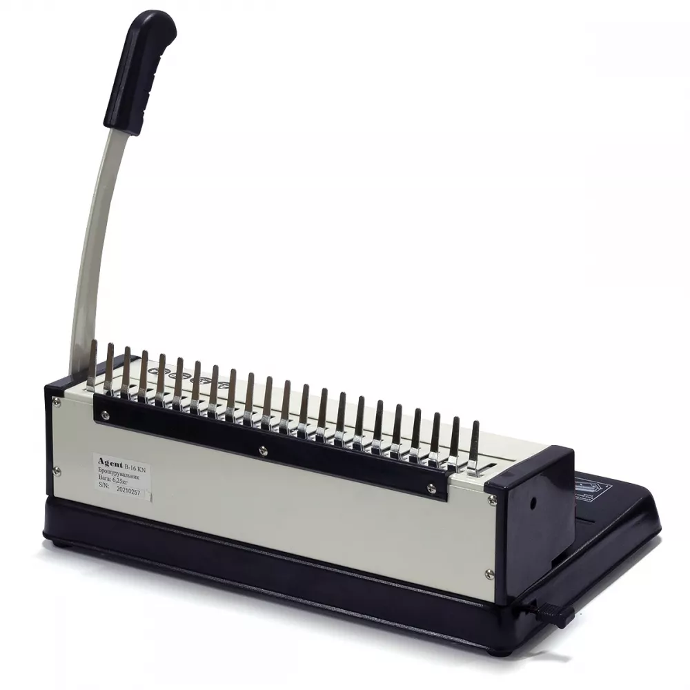 Биндер, брошюровщик Agent B-16 KN на пластиковую пружину. Тип перфорации Механический. Мощность перфорации 16 листов. Максимальная толщина переплета 250 листов. Регулировка глубины перфорации - есть (2,5 мм, 4,5 мм, 6,5 мм). Возможность отключения ножей Да, все. Ручки перфорации и переплета 1. Вес 6,25 кг. Габариты 380х240х160 мм.