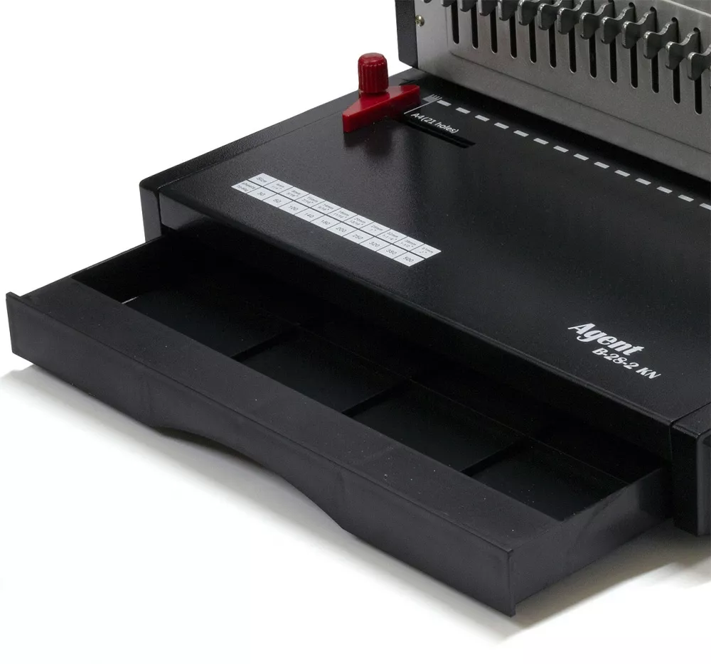 Биндер, брошюровщик Agent B-28-2 KN на пластиковую пружину. Тип перфорации механический. Мощность перфорации 28 листов. Максимальная толщина переплета 450 листов. Регулировка глубины перфорации есть. Возможность отключения ножей - есть, все. Ручки перфорации и переплета 2. Вес 12,7 кг. Габариты 410х370х265 мм.
