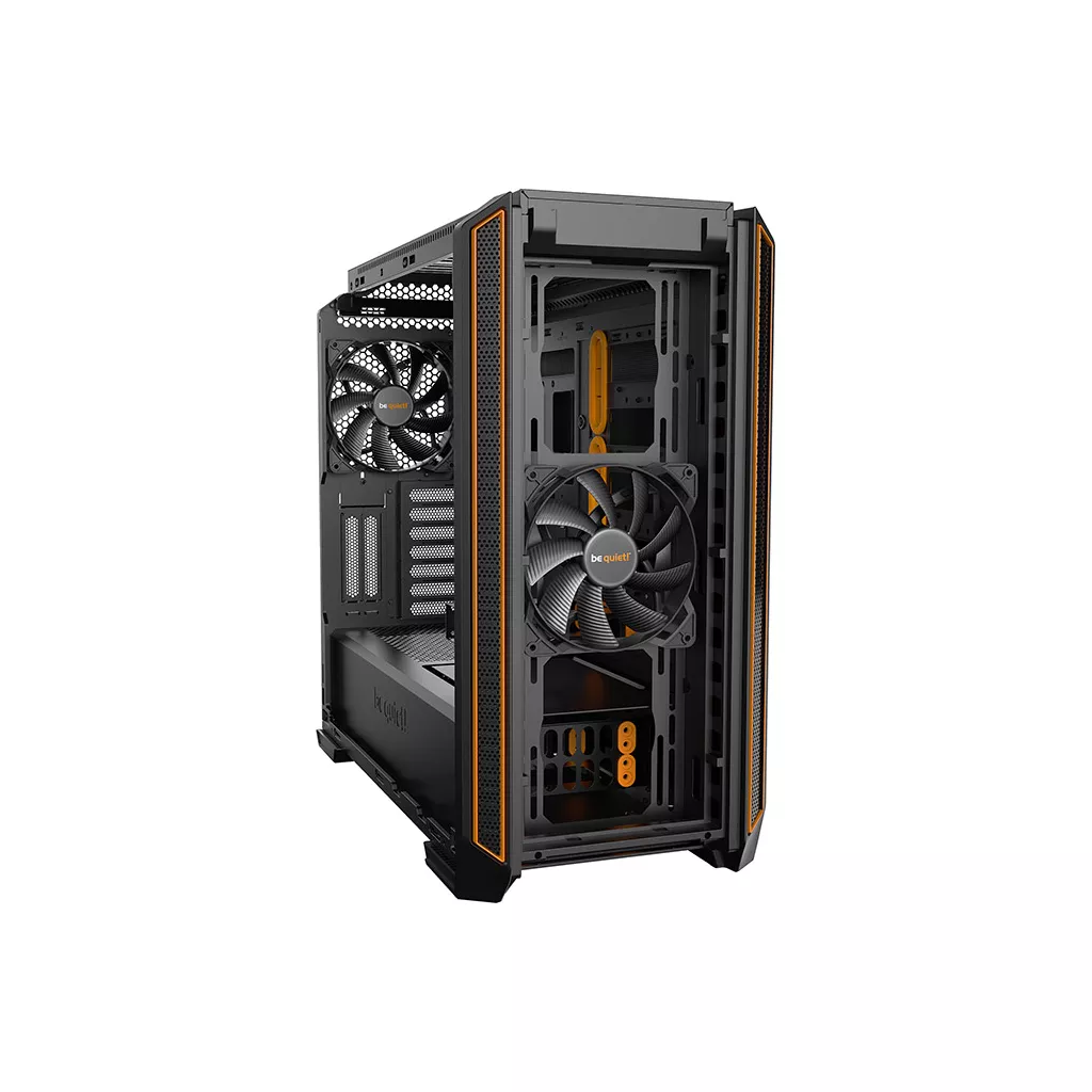 Несмотря на компактную конструкцию, Silent Base 601 обеспечивает огромный внутреннее пространство и монтажные отверстия для установки материнских плат формата E-ATX. Продуманная компоновка корпуса поддерживает установку нескольких видеокарт и систем охлаждения больших размеров. охлаждение. Радиаторы длиной до 360 мм могут быть размещены в передней, верхней или тыльной части корпуса. Использование съемного кронштейна позволяет быстро и легко установить радиатор в верхней части шасси. вид на компоненты системы внутри корпуса. Панель выполнена из закаленного тонированного стекла с затемнением по кромкам.