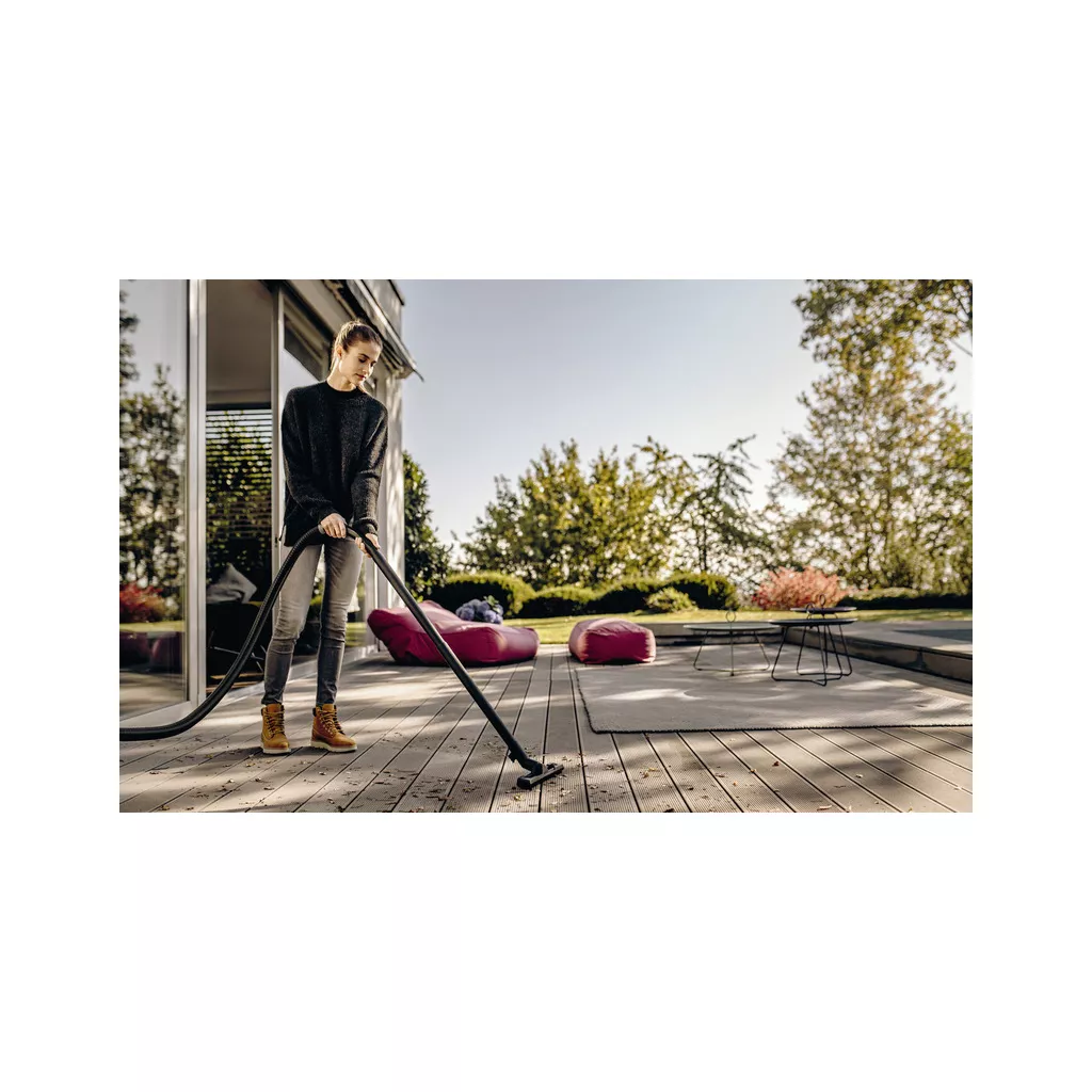 Этот энергоэффективный хозяйственный пылесос имеет сверхвысокую силу всасывания при невысокой потребляемой мощности (только 1000 Вт). Благодаря оптимально сочетающемуся с ним шлангу и насадке для пола он гарантирует высокое качество уборки при сборе мусора любых видов и размеров. При этом чередование операций влажной и сухой уборки не требует замены фильтра. Аппарат WD 4 V-20/5/22 оснащен и укомплектован 20-литровым ударопрочным пластиковым мусоросборником, 5-метровым кабелем, всасывающим шлангом длиной 2,2 м, плоским складчатым фильтром и фильтр-мешком. из нетканого материала. Запатентованное решение позволяет легко и быстро извлекать фильтр, не вступая в контакт с грязью. Благодаря съемной конструкции рукоятки насадки могут присоединяться непосредственно к всасывающему шлангу, компактно закрепляется на корпусе аппарата для хранения. На верхней панели пылесоса можно также уложить разные мелкие предметы. Для быстрого и удобного закрепления удлинительных трубок и половой насадки предусмотрены держатели, сформированные в отбойнике пылесоса. Другими преимуществами являются замки Pull & Push, позволяющие легко отсоединять и подсоединять мусоросборник, и эргономичную ручку для переноски.