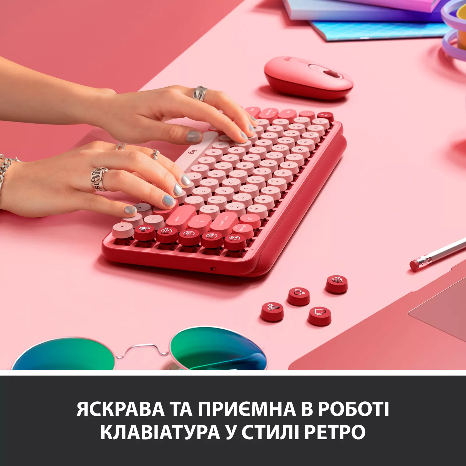 Будьте индивидуальны с помощью клавиатуры POP Keys. Добавьте мышь POP Mouse и подчеркните свою индивидуальность, украсив рабочий стол комплектом с клавишами эмодзи. . Удивите всех клавиатурой POP Keys в ретростиле Blast. Основные возможности, легкость выражения чувств Радуетесь? Злитесь? Влюбились? В беспроводной клавиатуре Pop Keys имеется восемь настраиваемых клавиш эмодзы, чтобы вы могли легко выражать свои чувства во время разговора. Вы можете назначать этим клавишам любые значки эмодзы по своему усмотрению, используя программное обеспечение Logitech, или, нажимая клавишу меню эмодзи, во время разговора с друзьями выбирать нужные пиктограммы в специальном окне. В настоящее время использование эмодзы и программное обеспечение поддерживают только операционные системы Windows и MacOS. Пальцы на клавишах легко пружинят, и при каждом нажатии механические переключатели дают отчетливый тактильный отбой. Эта модель вернет вам старое удовольствие от набора текста.