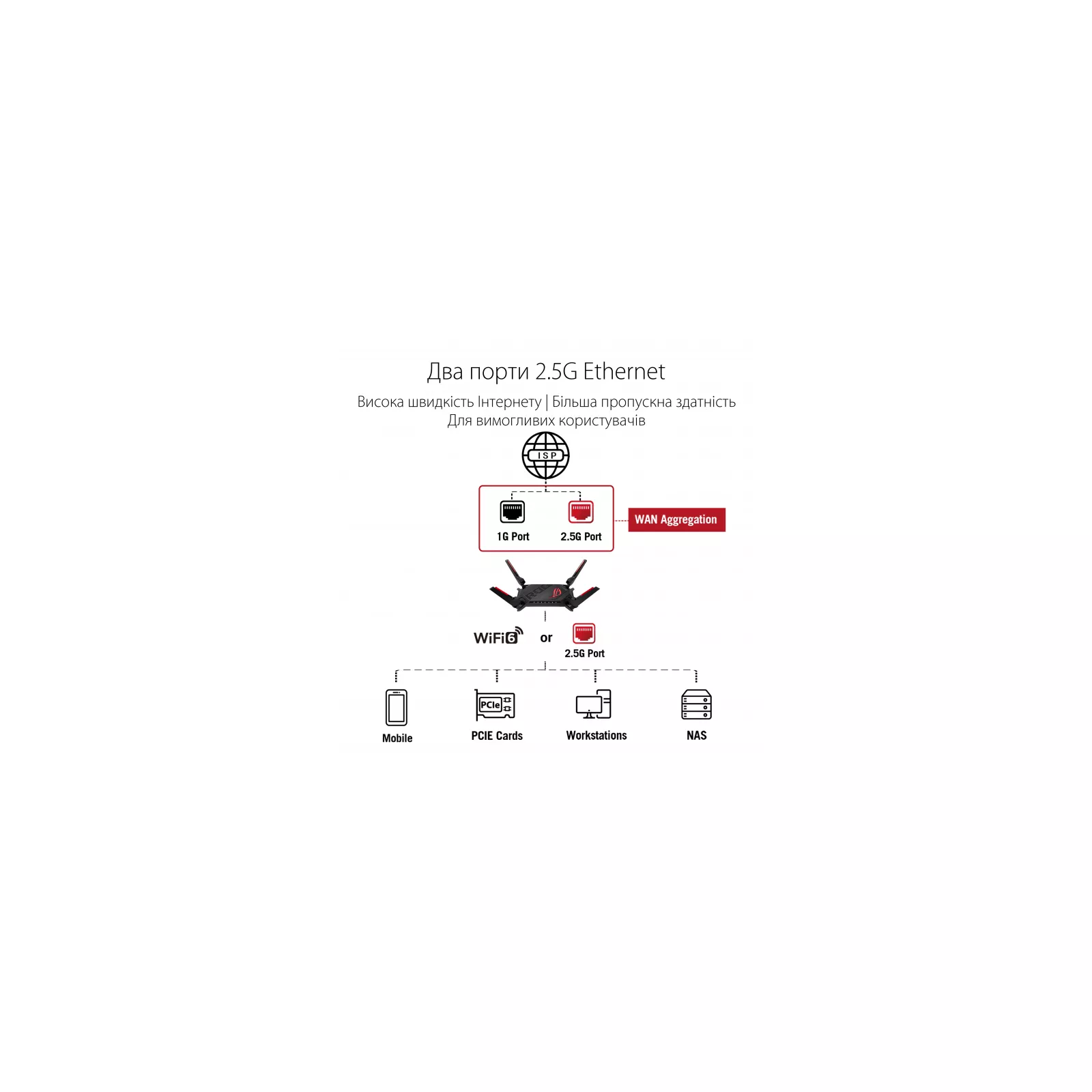 ROG Rapture GT-AX6000 – это скоростной игровой маршрутизатор стандарта Wi-Fi 6, обеспечивающий пропускную способность беспроводного подключения на уровне 6000 Мбит/с. Помимо превосходной производительности данная модель может похвастаться ярким внешним видом за счет съемных красно-черных антенн и гибко настраиваемой полноцветной подсветки Aura. GT-AX6000 предлагает два порта с пропускной способностью 2.5 Гбит/с каждый, поддерживающий режимы объединения и балансировки. Это позволяет воспользоваться всеми преимуществами высокоскоростного интернет-доступа или предоставить повышенную пропускную способность устройствам в локальной сети.