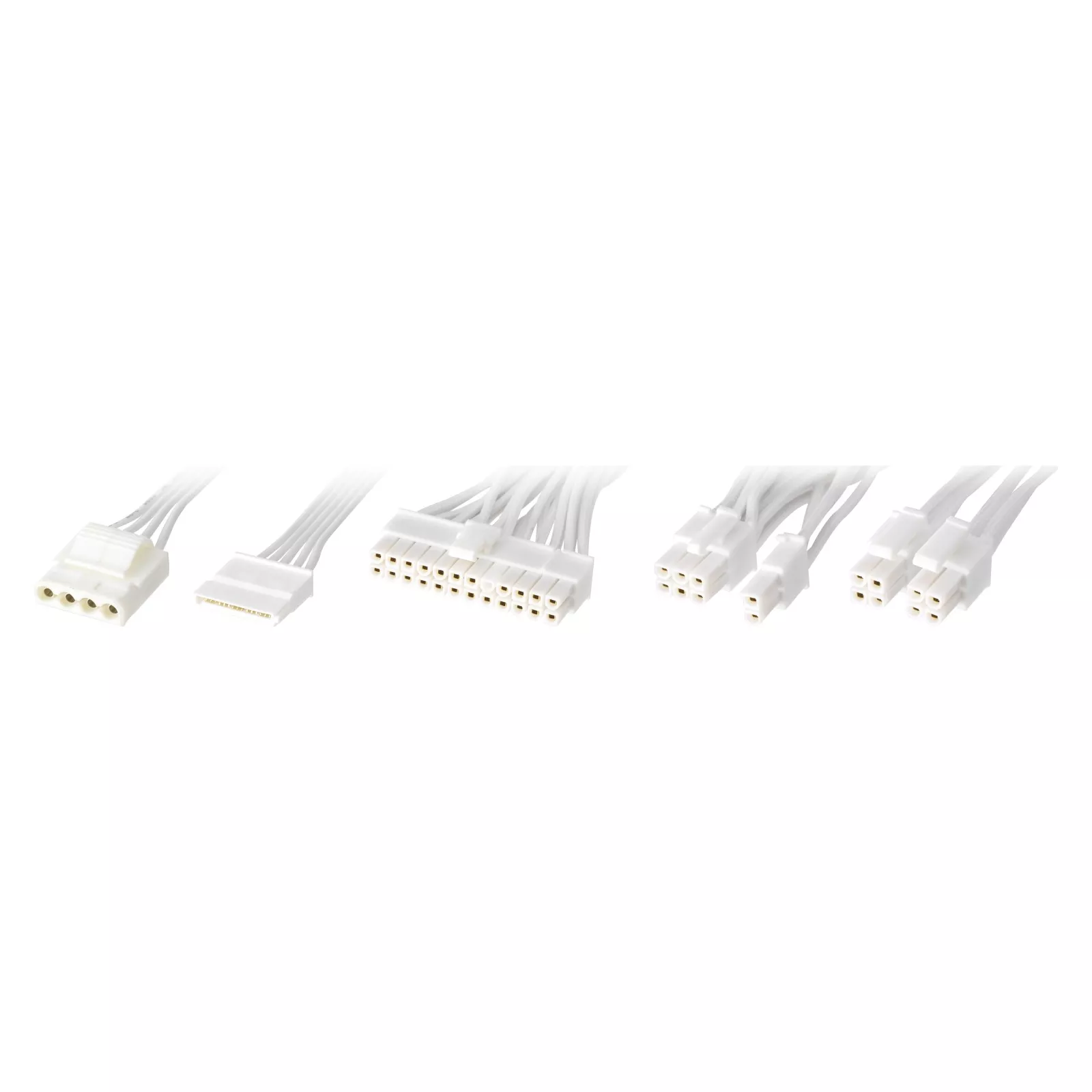 В комплект блока питания входят один 24- контактный кабель питания для материнской платы, 8-контактный (6+2) кабель для питания видеокарт PCIe и 8-контактный кабель для питания процессора. Все эти кабели имеют интегрированные конденсаторы для сглаживания пульсации напряжения. В комплект блока питания входит также купон со скидкой на продукцию компании CableMod.