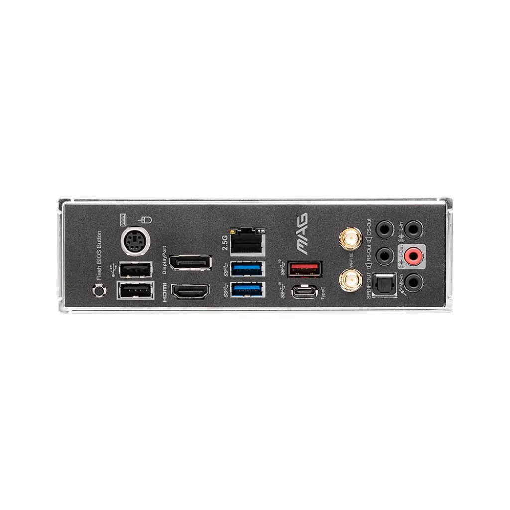 | Наружные порты | 1 x DisplayPort 1.4, 1 x Flash BIOS Button, 1 x HDMI, 1 x optical SPDIF out, 1 x PS/2, 1 x RJ45, 1 x USB 3.2 Gen 2x2 Type-C, 1 x USB 3.2 Gen2 Type-A, 2 x USB 2.0, 2 x USB 3.2 Gen 1 Type-A, 5 x Audio, Wireless/Bluetooth |