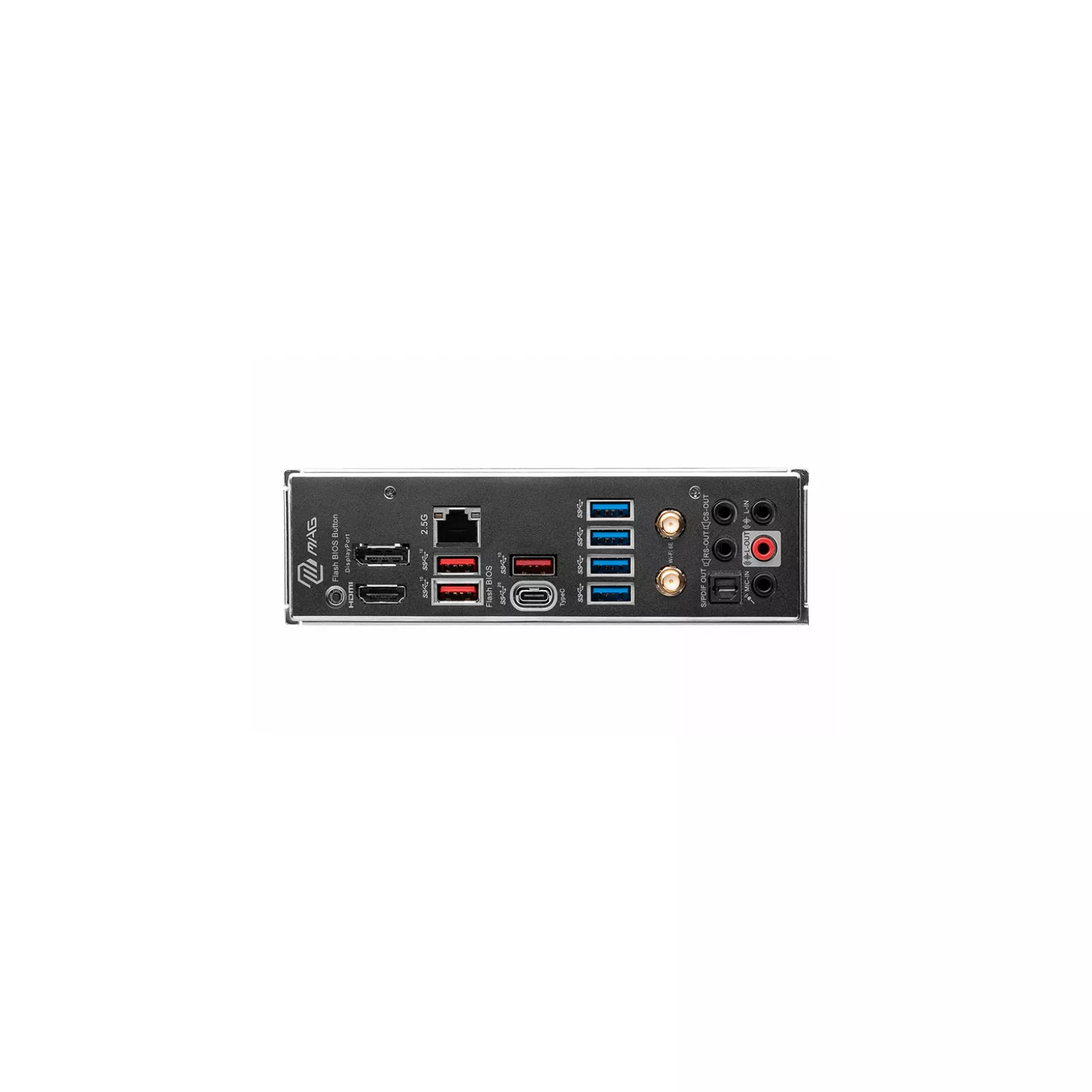 | Наружные порты | 1 x DisplayPort 1.4, 1 x Flash BIOS Button, 1 x HDMI, 1 x optical SPDIF out, 1 x RJ45, 1 x USB 3.2 Gen 2x2 Type-C, 3 x USB 3.2 Gen 2 Type-A, 4 x USB 3.2 Gen 1 Type-A, 5 x Audio, Wi-Fi/Bluetooth Antenna |