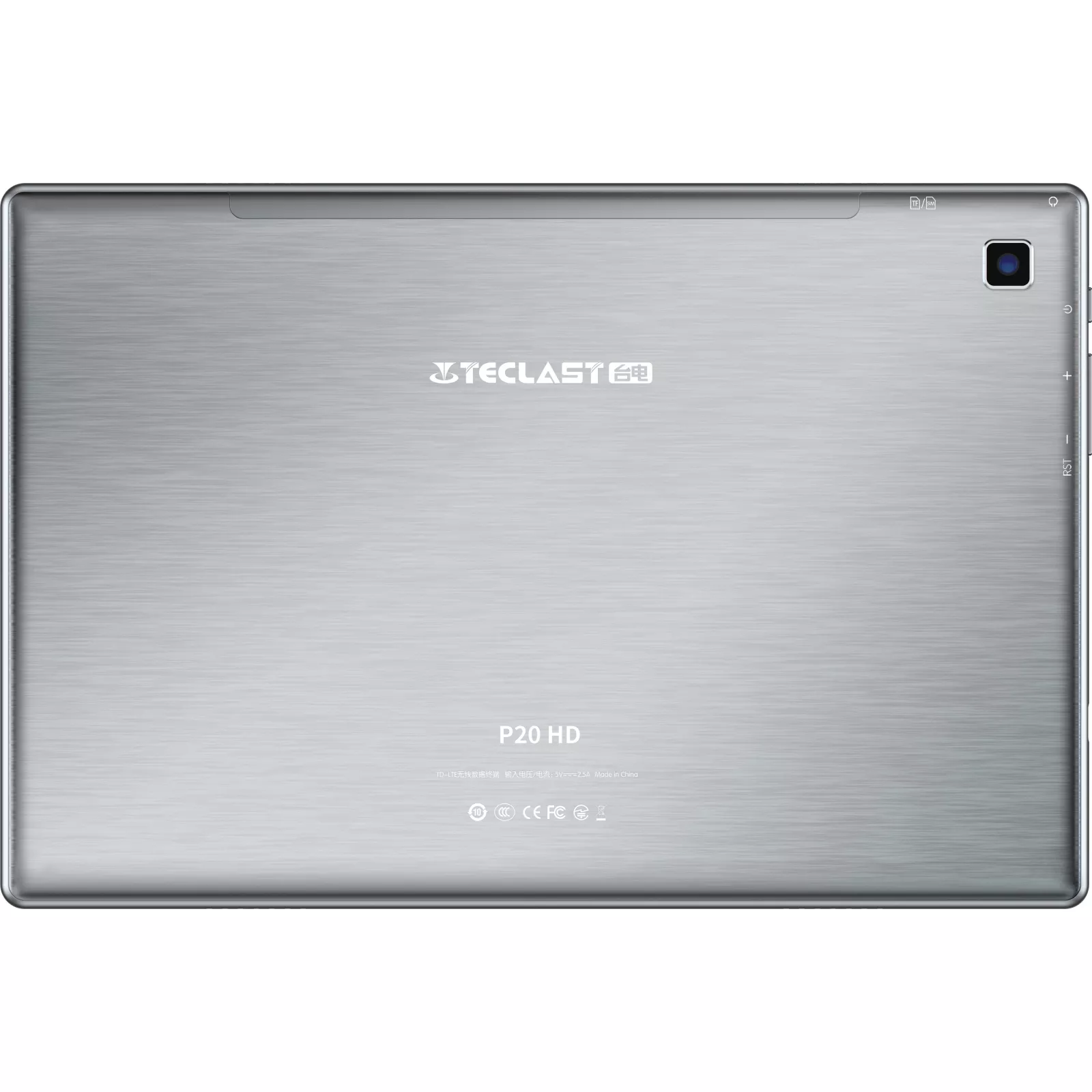Рамка вокруг экрана у Teclast P20 HD черного цвета Задняя панель в Teclast P20 HD металлическая, темно-серебристого цвета, стилизованная под нержавеющий металл.За счет этого задняя панель выглядит очень стильно.Торцы у Teclast P20 HD закруглены.Вес планшета небольшой, планшет удобно лежит в руке и не скользит. в верхнем углу расположена задняя камера 5 Мп. Посередине сверху на лицевой панели расположена фронтальная камера 2 Мп. индикатор)а освещенности, что вполне понятно для данной ценовой категории планшетов.