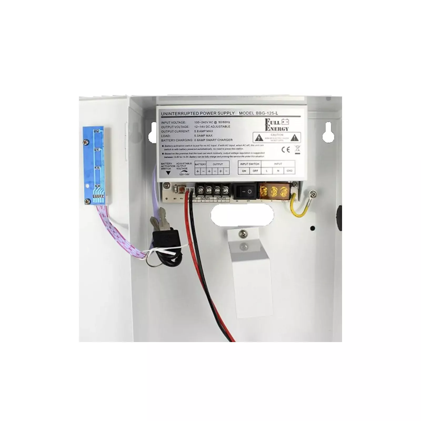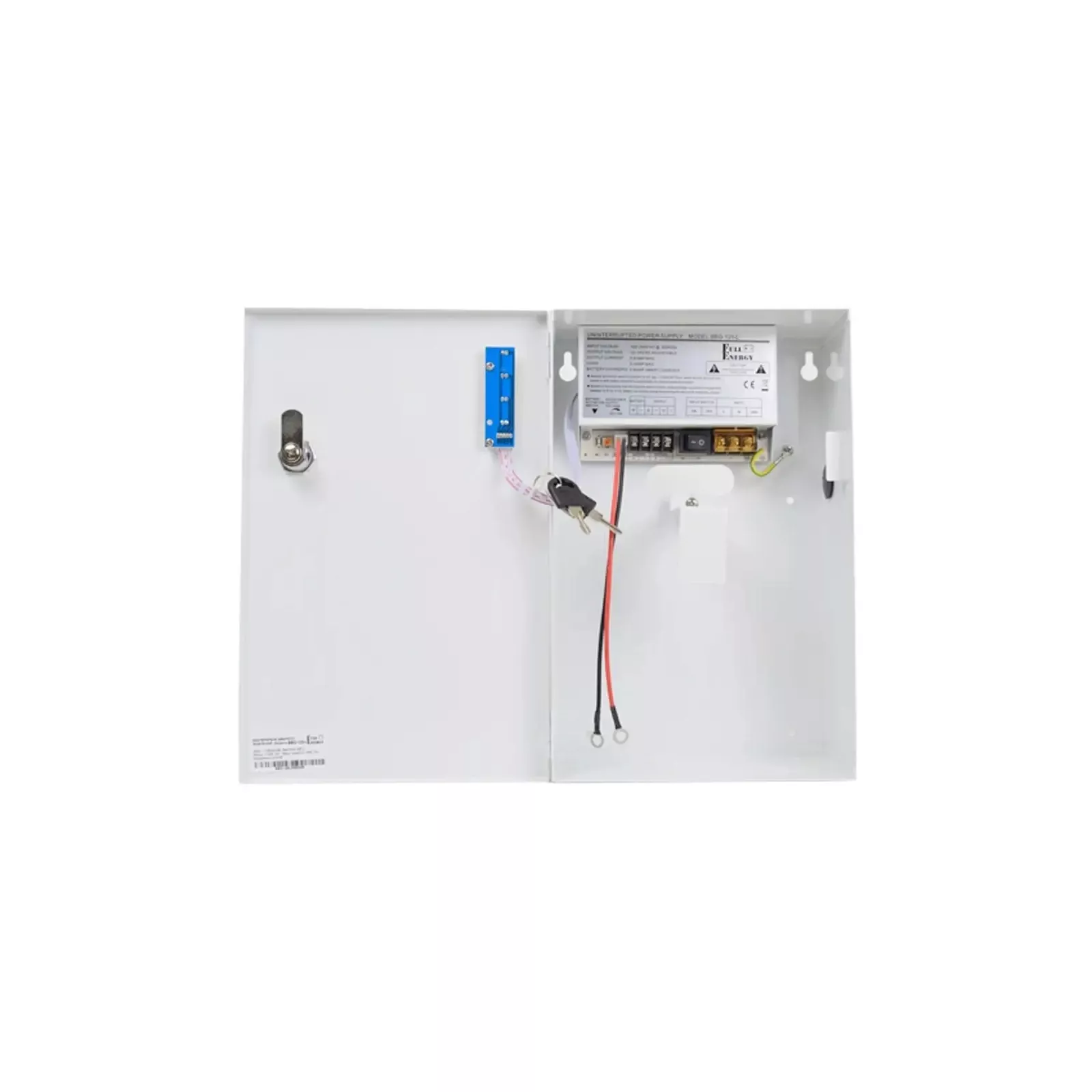 Бесперебойный блок питания импульсный, одноканальный. Питание AC100-240V/50-60Hz клеммник, выходное напряжение DC12...14V/5A, клеммник. Отсек для аккумулятора: 12В, 18Ач. Защита от перенапряжения, КЗ, перегрузки по току, а также защита заряда/разряда аккумулятора. Металлический корпус с крышкой и замком. Размеры 300х195х80 мм