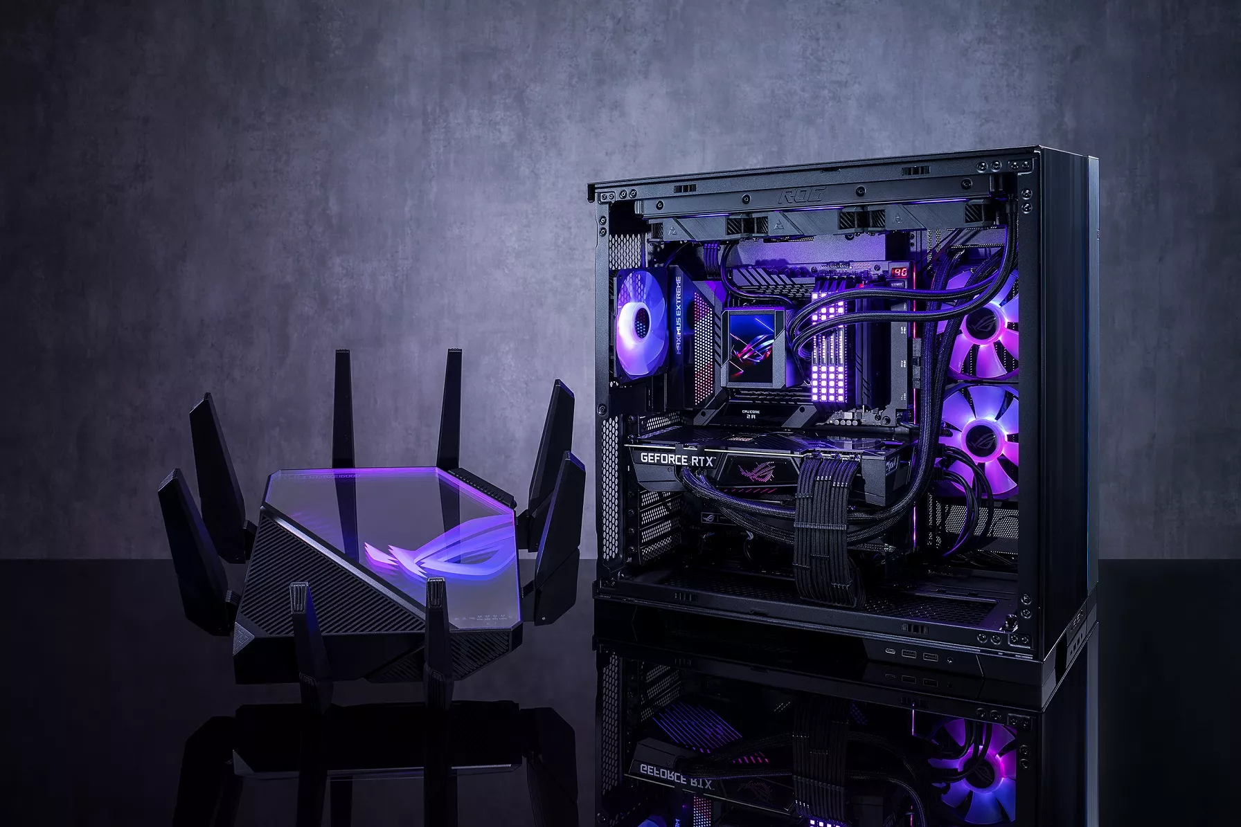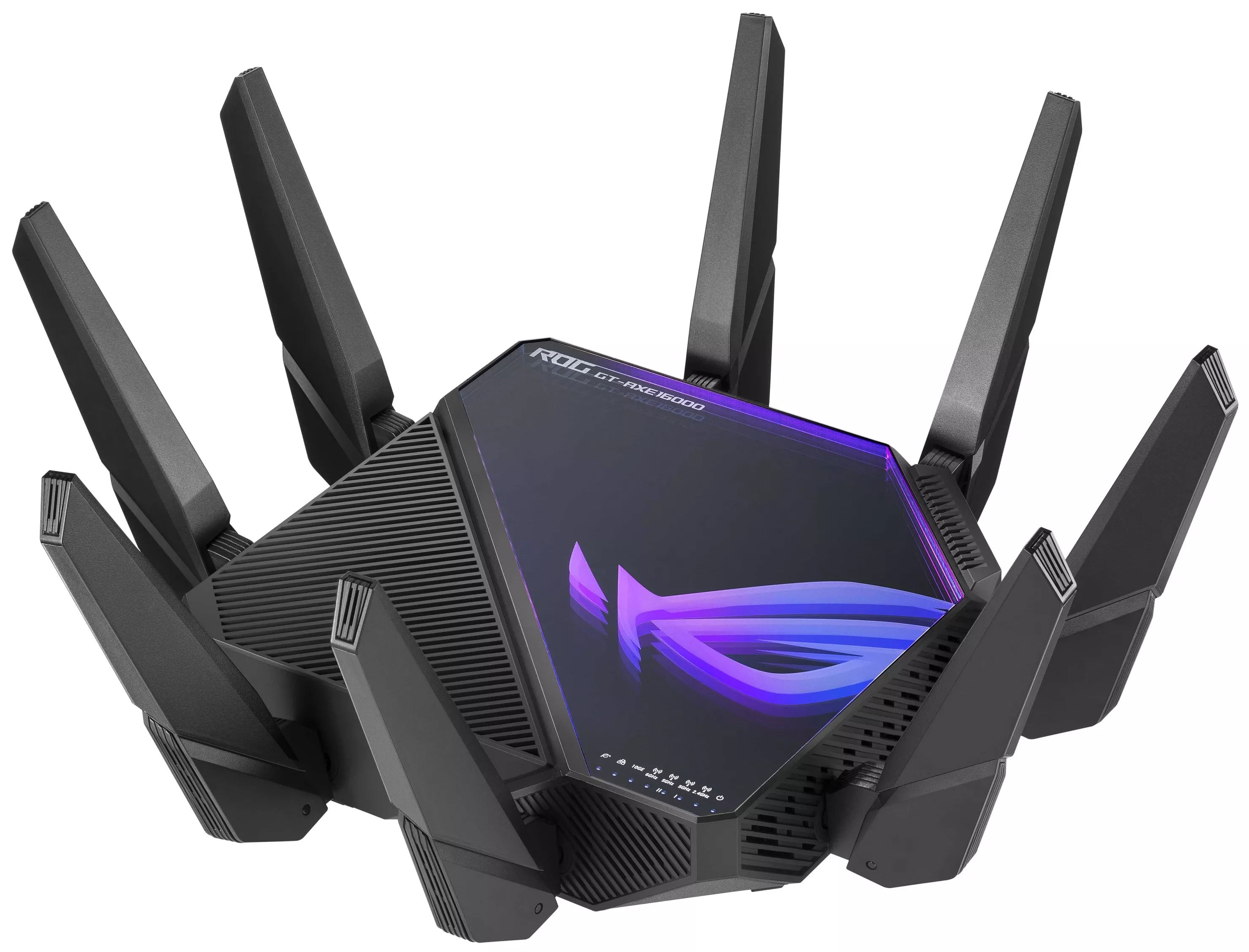 ROG Rapture GT-AXE16000 отличается стильным дизайном с яркой полноцветной подсветкой Aura, что воспроизводит визуальный эффект бесконечного зеркального отображения. GT-AXE16000 подчеркнет ваш собственный игровой стиль!