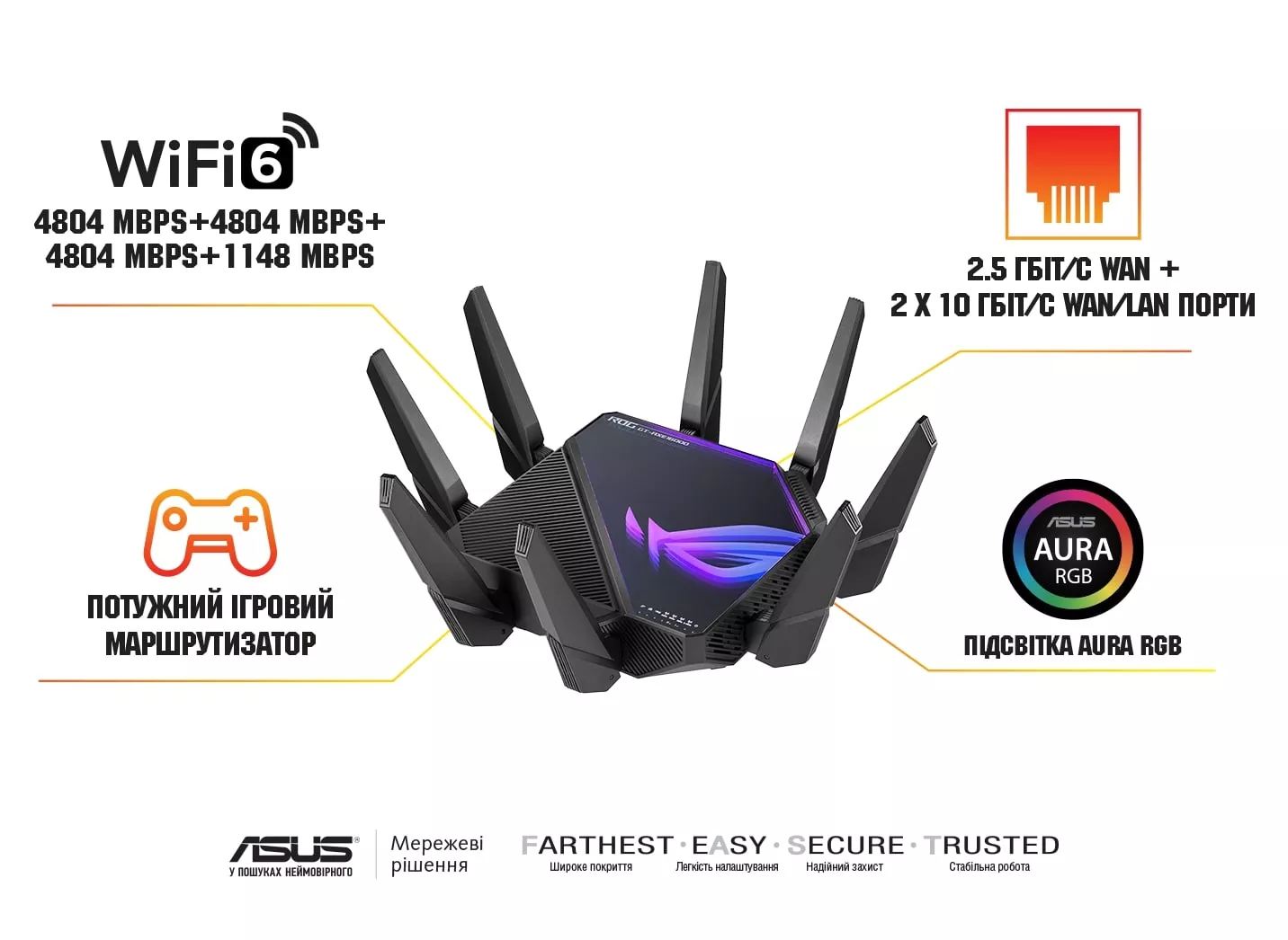 Купить ASUS Маршрутизатор GT-AXE16000 Wi-Fi 6E 4xGE LAN 1x2.5GE WAN 2x10GE LAN/WAN 1xUSB3.2 1xUSB2.0 MU-MIMO OFDMA MESH gaming Вы можете в компании "А-ТЕХНО" через корзину или позвонив по указанным телефонам.