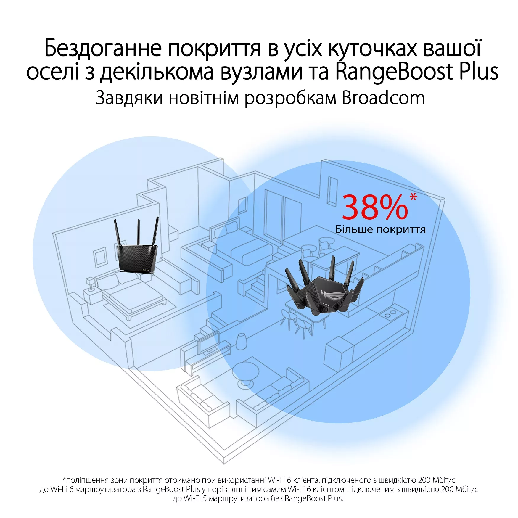 ASUS RangeBoost Plus – это последняя, самая мощная версия известной фирменной технологии ASUS RangeBoost, значительно улучшающая площадь покрытия и производительность сети Wi-Fi по сравнению с другими моделями без RangeBoost. Благодаря использованию следующего поколения флагманского чипсета Broadcom в сочетании с эксклюзивными технологиями ASUS, например ASUS RangeBoost Plus, общая площадь покрытия сетью была расширена до 38%.