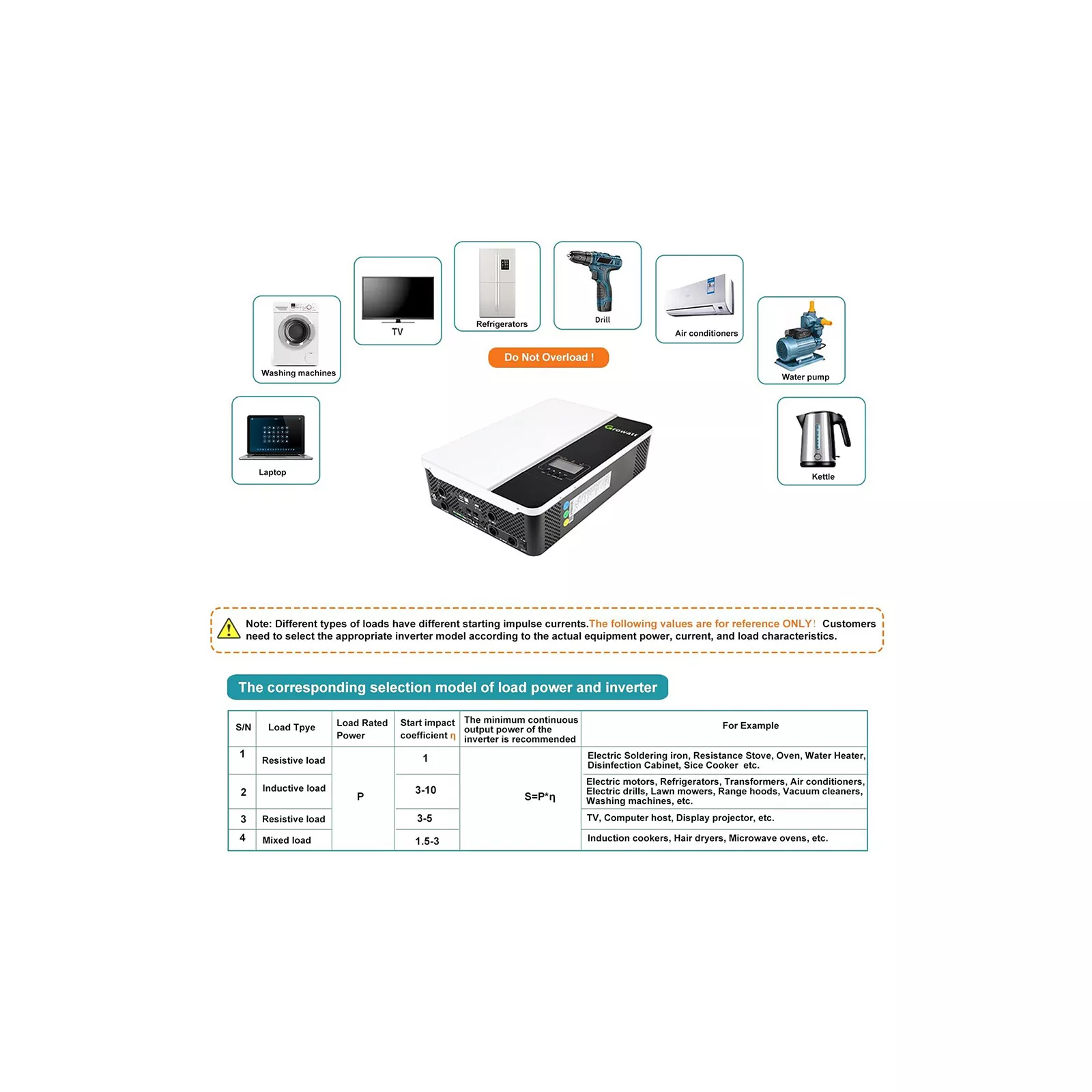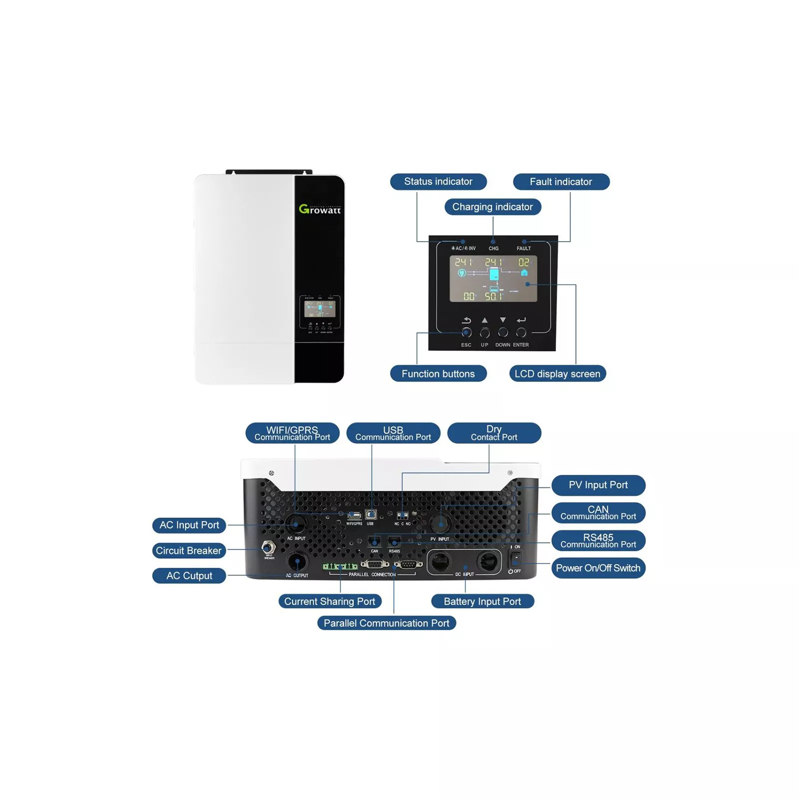 Это многофункциональный солнечный инвертор, интегрированный с солнечным контроллером заряда MPPT, высокочастотным инвертором чистой синусоиды и функциональным модулем ИБП в одном устройстве, идеально подходящем для резервного питания от сети и самопотребления. Этот инвертор может работать как с аккумуляторами, так и без них.