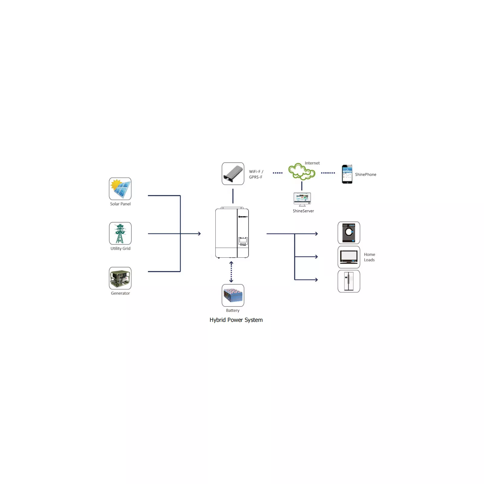 Для полноценной работы всей системы необходимы и другие устройства, такие как фотоэлектрические модули, генератор или бытовая сеть. Пожалуйста, проконсультируйтесь с вашим техническим специалистом по системной интеграции по другим возможным архитектурам системы в зависимости от ваших требований. Модуль WiFi/GPRS – это устройство мониторинга, устанавливаемое на инвертор. С помощью этого устройства пользователи могут контролировать состояние фотоэлектрической системы с мобильного телефона или веб-сайта в любое время в любом месте.