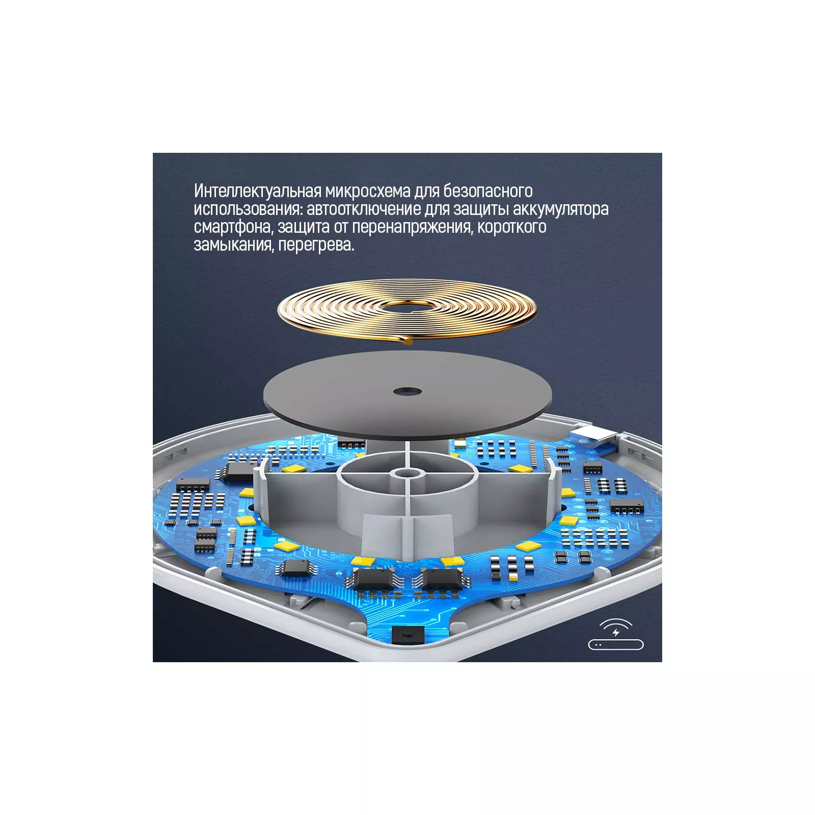 | Дополнительные характеристики | встроенная светодиодная подсветка дает возможность использовать устройство в качестве ночника, защита от перенапряжения, интеллектуальная микросхема для безопасного использования: автовыключение для защиты аккумулятора смартфона, короткого замыкания, максимальная выходная мощность заряда составляет до 1 не нужно снимать чехол со смартфона, перегрева, поддерживает стандарт QI, поддержка технологии беспроводной зарядки Qi или Qi Fast Charger, резиновые ножки позволяют прибору не скользить по поверхности |