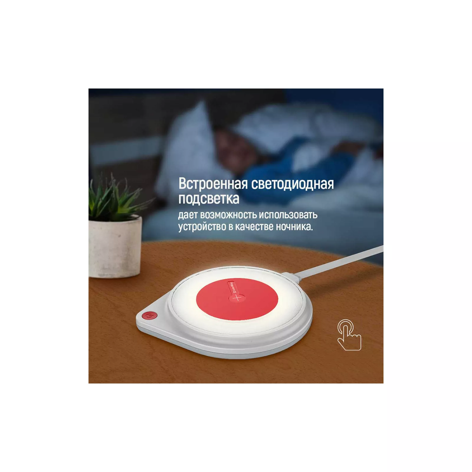Инструкция: Подключите устройство к адаптеру питания с помощью кабеля USB. Разместите смартфон в центре. Индикатор (светодиод возле кнопки включения): устройство подключено – светит белым светом/заряжание смартфона – мигает белым светом/аварийный режим (чехол содержит металл, прекратите зарядку) – светит красным светом. Для управления ночником нажмите кнопку включения/выключения.