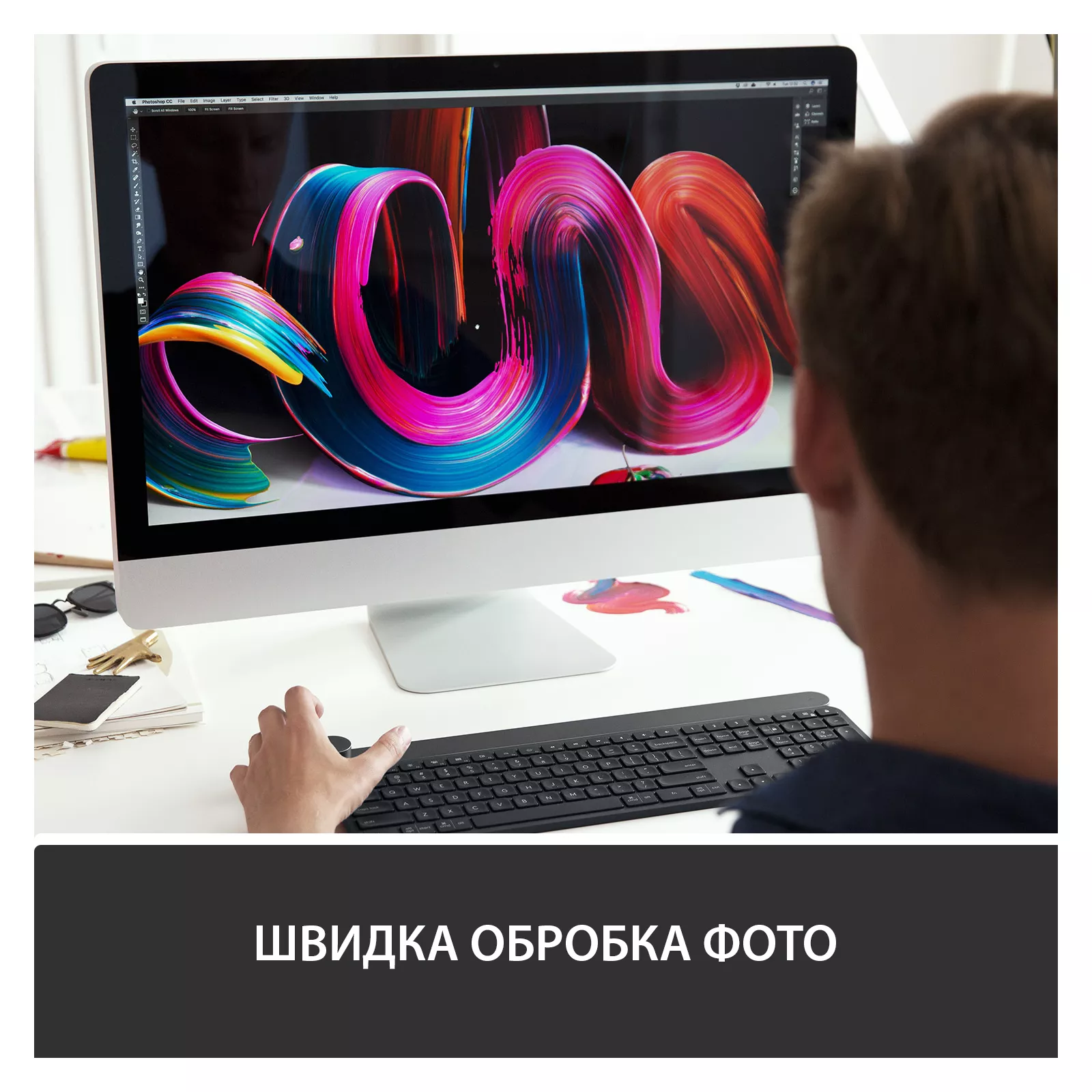 Клавиатура Craft с легкостью адаптируется к используемому приложению и способам работы с ним. Установив дополнительные профили в приложении Logitech Options, можно использовать колесо-переключатель для работы с Adobe Photoshop CC, Adobe Photoshop Lightroom Classic CC, Adobe CC, Adobe Premiere Pro, Adobe InDesign CC, а также Microsoft PowerPoint, Microsoft Excel и Microsoft Word.