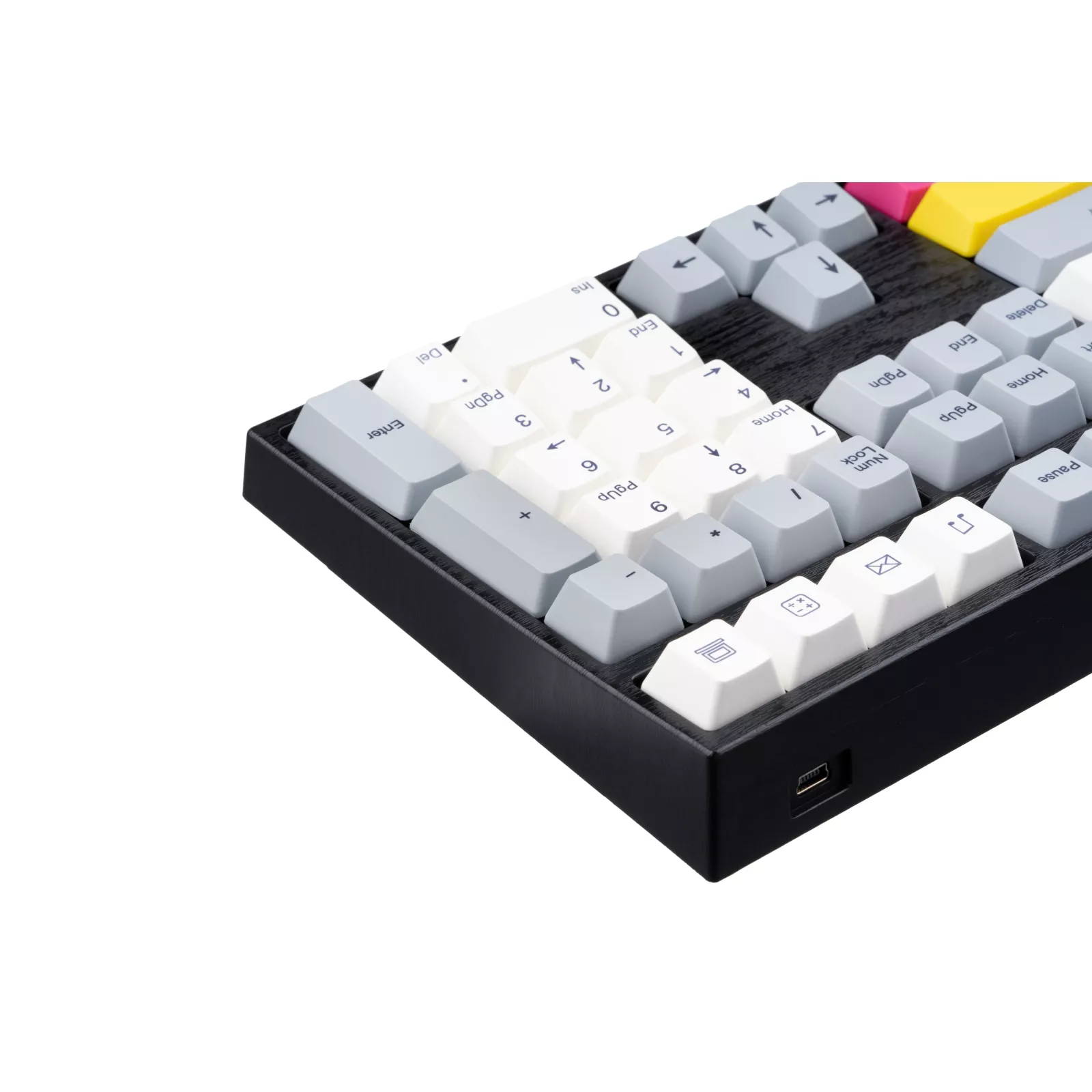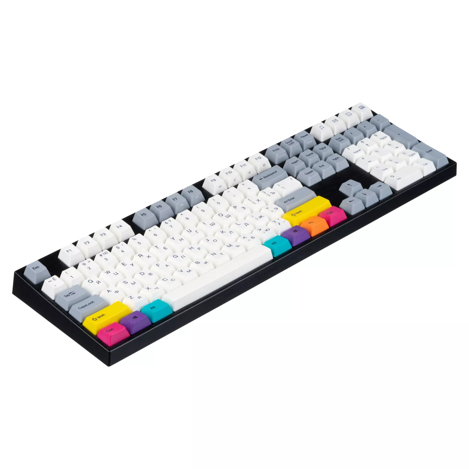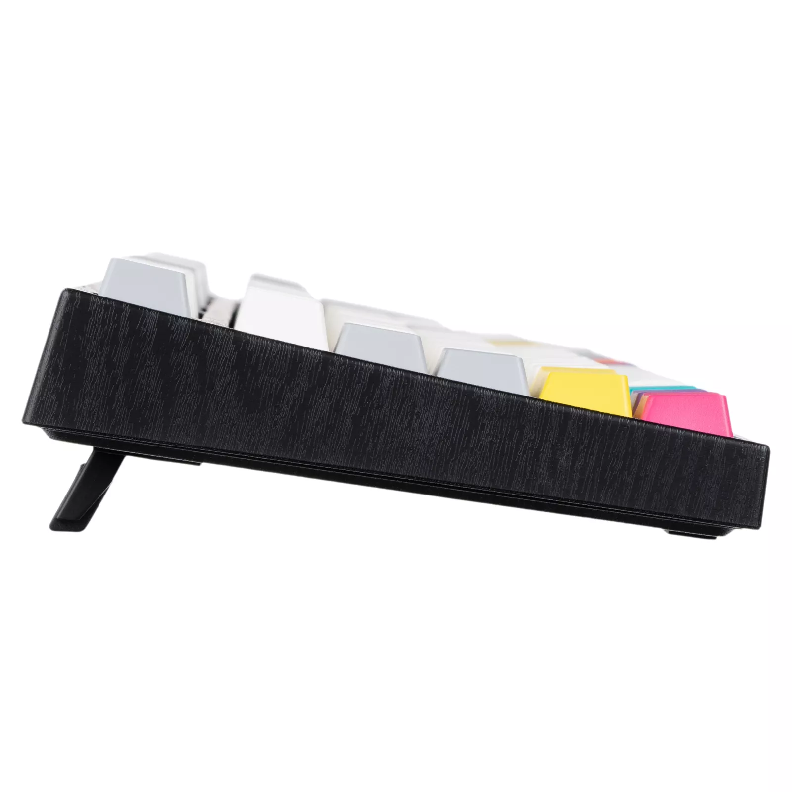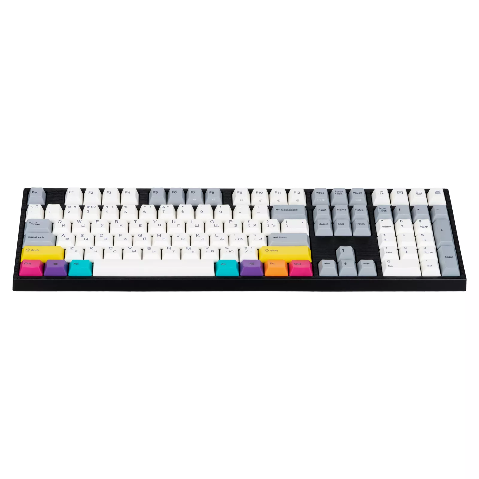 Varmilo CMYK – это классическая и одновременно эффектная механическая клавиатура, оснащенная укомплектована яркими клавишами, создающими уникальную дизайнерскую философию устройства. Основной цвет модели CMYK – холодный белый, плавно переходящий в серый, а главную визуальную стилистику устройства создают яркие клавишные колпачки в желтом, розовом, фиолетовом, оранжевом и голубом цветах. Настоящий арт-дизайн в современных технологиях.