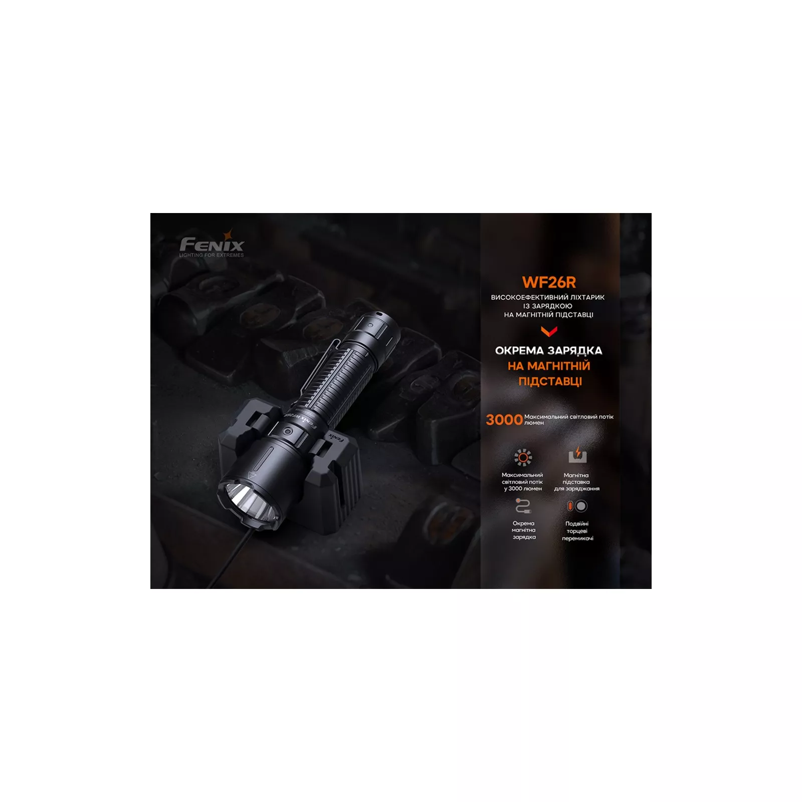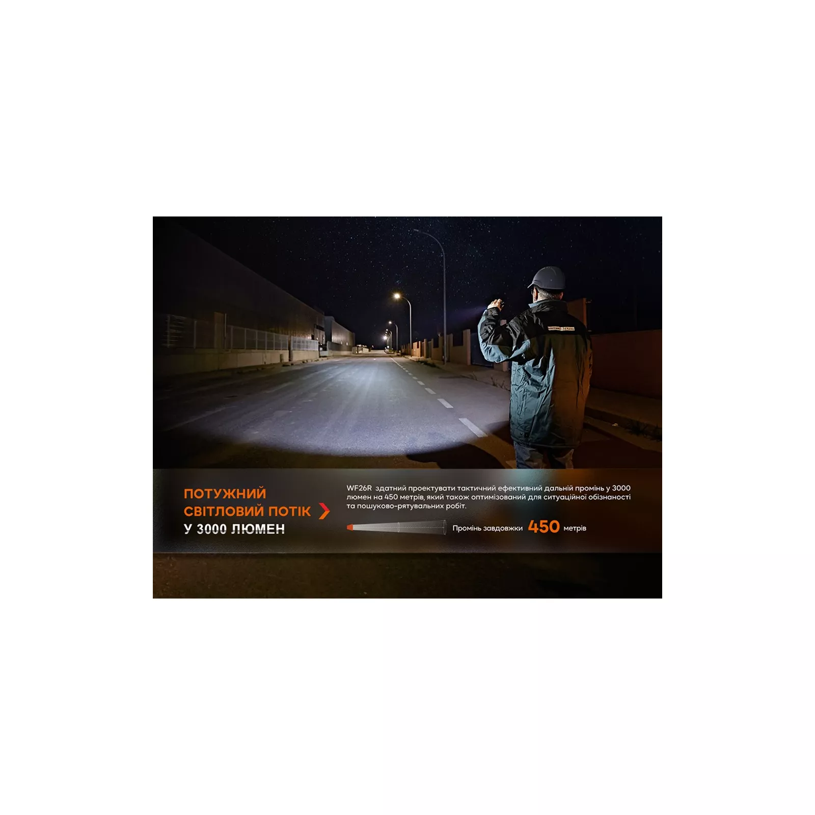 WF26R – высокопроизводительный фонарь ручного типа от компании Fenix. Модель представляет собой усовершенствованную версию Fenix RC20 и генерирует освещение яркостью 3000 люмен. Дальность луча варьируется в пределах 47-450 метров, позволяя качественно подсветить объекты на ближних и дальних дистанциях. За освещение отвечает светодиод Luminus SST70 белого цвета с ресурсом работы не менее 50 тысяч часов. В качестве источника питания используется фирменный Li-ion аккумулятор ARB-L21 V2.0 емкостью 5000 мАч, который обеспечивает стабильную работу устройства до 44 часов в экономном режиме.