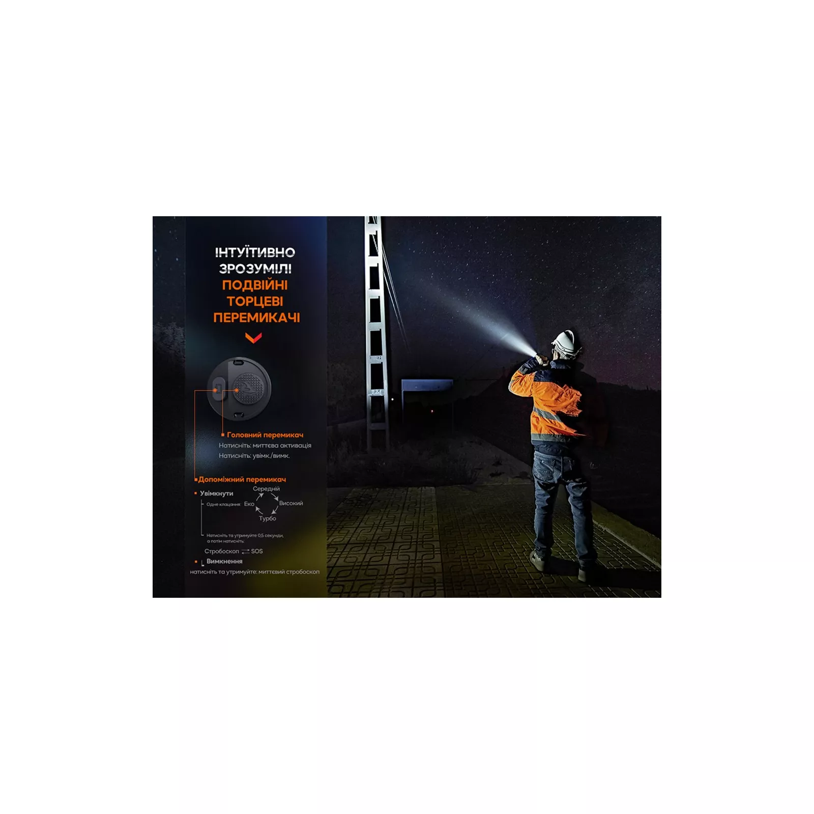Продолжительность работы в режиме Turbo исчисляется в сумме со временем на пониженных яркостях после срабатывания встроенной защиты от перегрева. Мерцающие режимы Strobe: 3000 люмен; SOS: 100 люмен. Приведенные показатели времени работы в 6 режимах были получены в ходе лабораторного тестирования с использованием одного Li-ion аккумулятора Fenix ARB-L21-5000 V2.0 при температуре воздуха 21&3°C и влажности в пределах 50%-80% . Продолжительность работы фонаря может отличаться в зависимости от условий окружающей среды и типа используемого элемента питания.