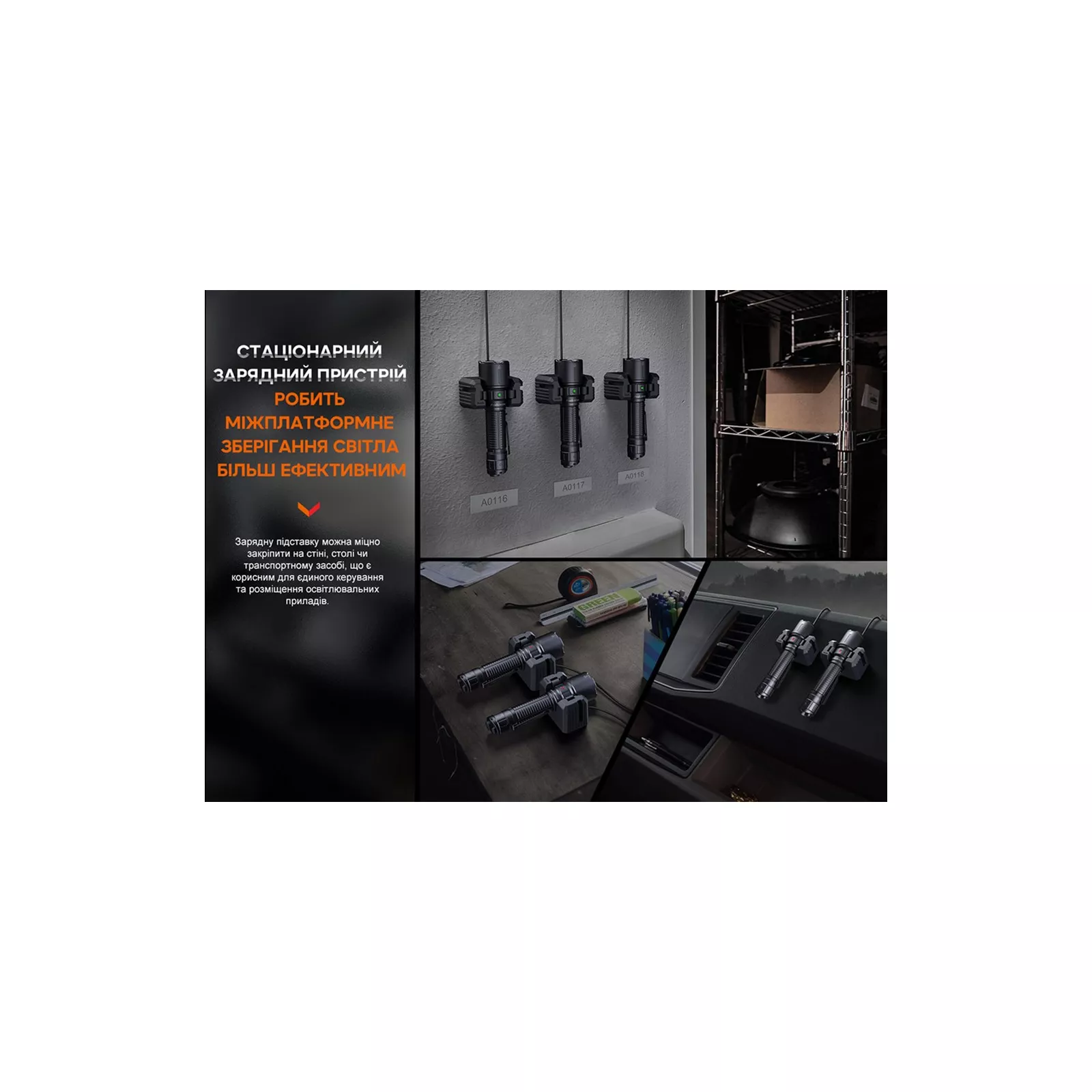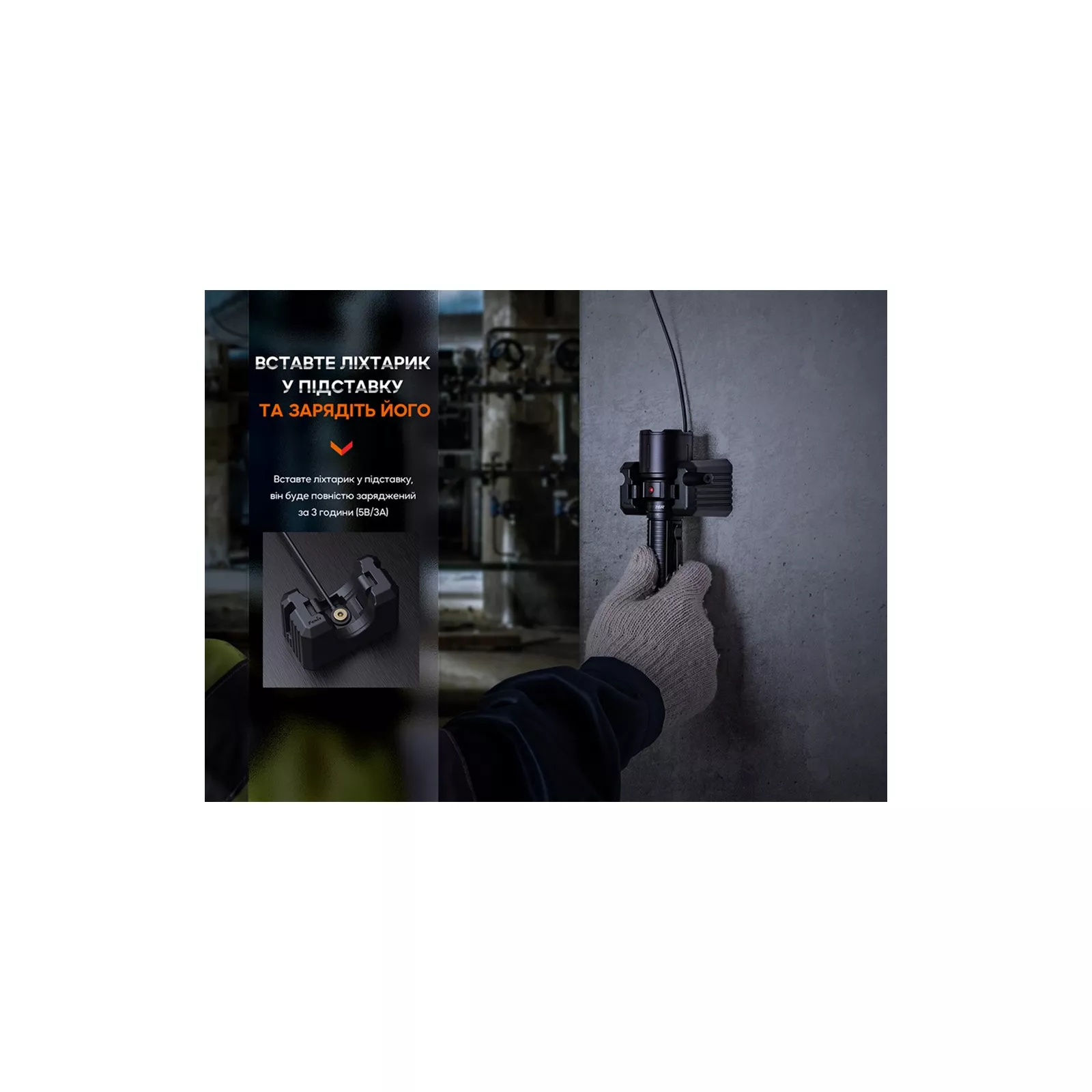 Для заполнения заряда батареи достаточно поместить фонарь в специальную подставку с магнитным кабелем (5 В 3 А) – заряжание от 0% до 100% занимает 3 часа. Стационарная подставка крепится к столу, фиксируется на стене и любой другой ровной поверхности для удобства эксплуатации. Магнитный кабель можно отсоединить от подставки и носить в кармане, чтобы быстро подзарядить фонарь в пути от переносного Power Bank. Режимы освещения Fenix WF26R запрограммирован на 6 режимов работы, включая 4 режима с постоянным освещением и 2 функциональных режима с мигающим светом.