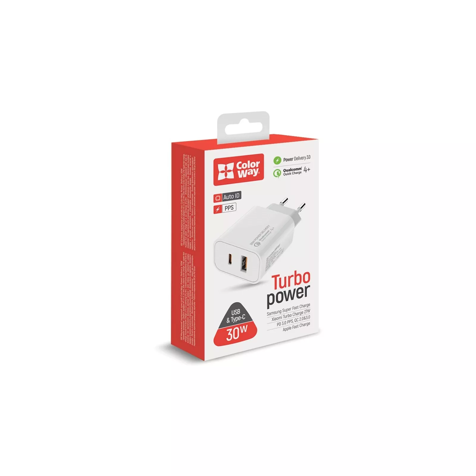 Сетевое зарядное устройство для Colorway Power Delivery USB PPS (Type-C PD + QC3.0) - это мощный адаптер, оснащенный и укомплектованный двумя портами USB и PD, что позволит одновременно заряжать 2 устройства. Зарядное устройство поддерживает новейшую технологию быстрого заряда Xiaomi turbo charge 27W, Apple Fast Charge, Huawei FCP, Quick Charge 2.0&3.0, Samsung SFC/AFC выходной мощностью до 30 Вт. Подходит как для скоростной зарядки мобильных устройств, так и для зарядки девайсов в обычном режиме.