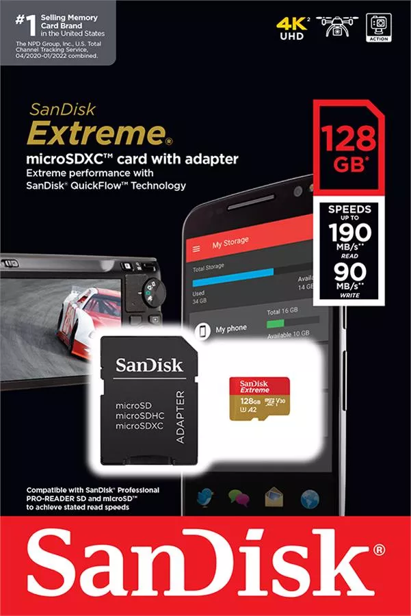 Снимайте динамические фотосюжеты или видео в формате 4K UHD благодаря скорости записи до 130 МБ/с. Снимайте больше и быстрее с картой SanDisk Extreme microSDXC UHS-I.