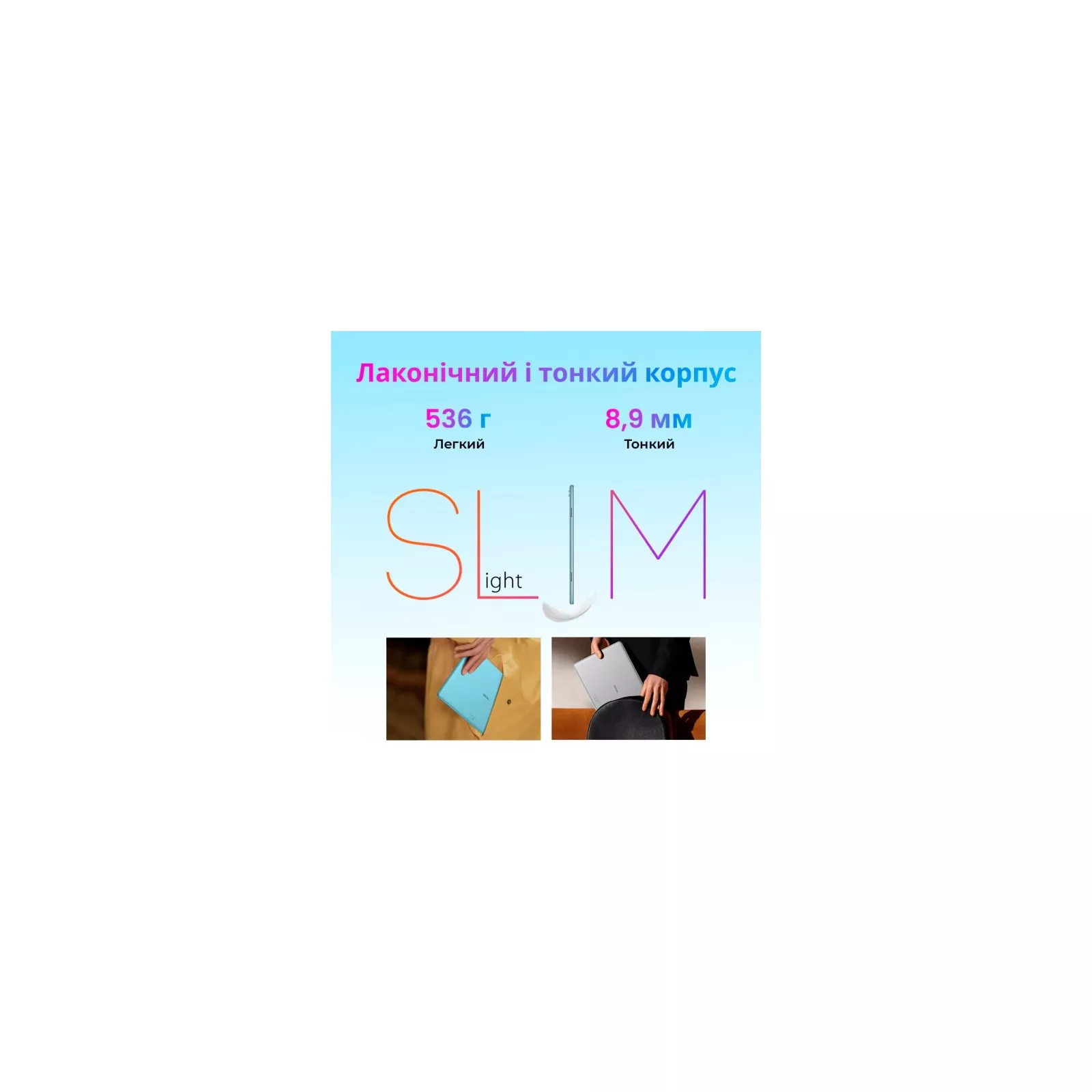 Вес планшета составляет всего 536 г. Толщина корпуса – 8.9 мм.