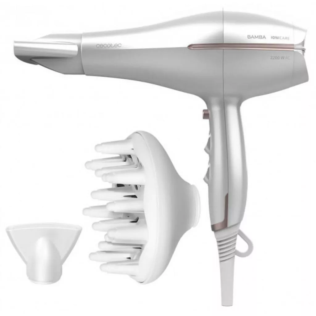 Фен CECOTEC Bamba IoniCare 5300 Maxi Aura Фэн с ионизацией и с мощным профессиональным двигателем переменного тока нового поколения мощностью Мощность 2200 Вт сушит волосы равномерно и быстро. С Real Ion волосы становятся более блестящими и гладкими. Благодаря высокой скорости потока и технологии ухода за волосами волосы будут защищены, они не потеряют блеск и останутся эластичными. Фен включает в себя прямую насадку диффузор для максимально и в полном объеме его объема, а также функцию холодного воздуха. CECOTEC Bamba IoniCare 5300 Maxi Aura
