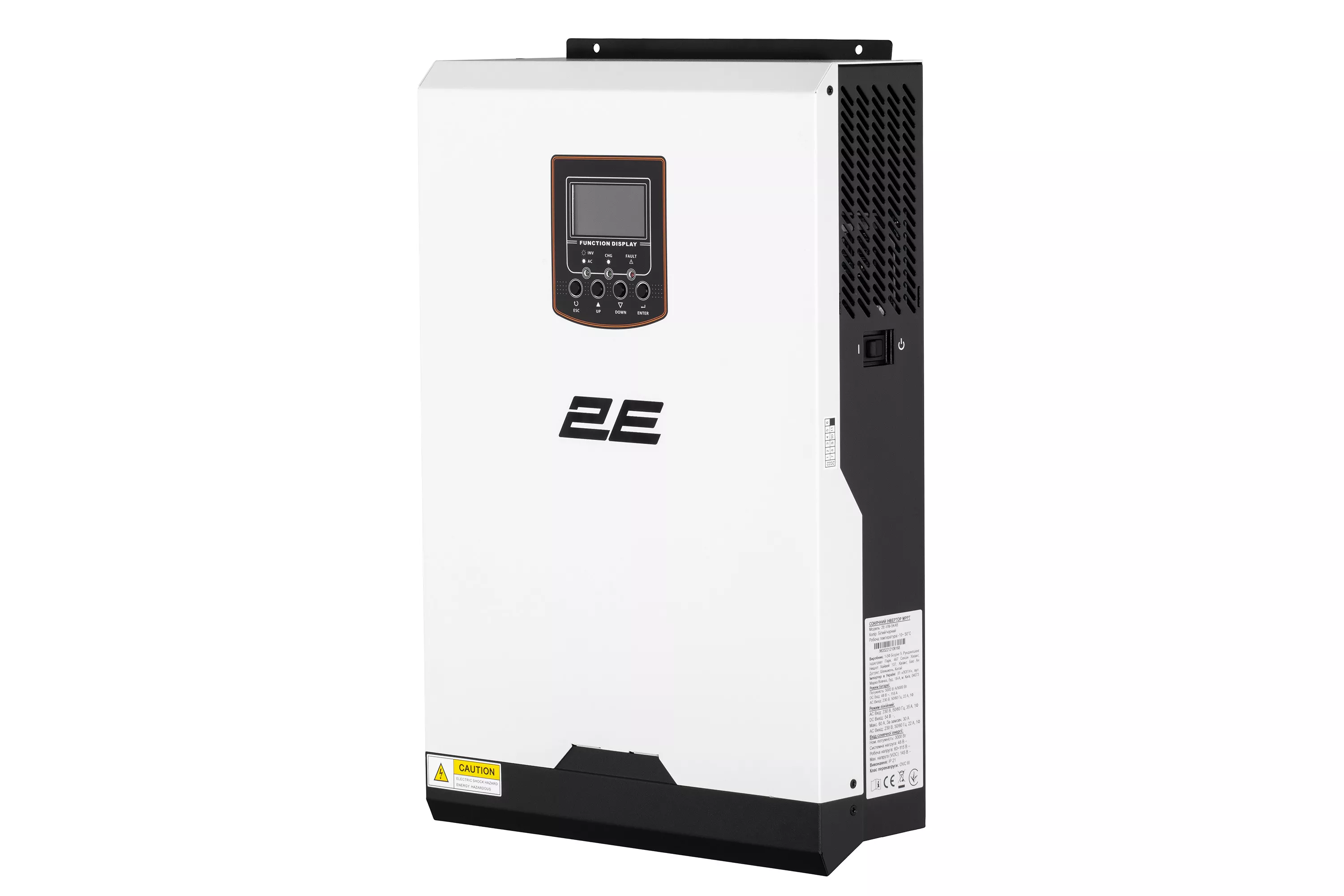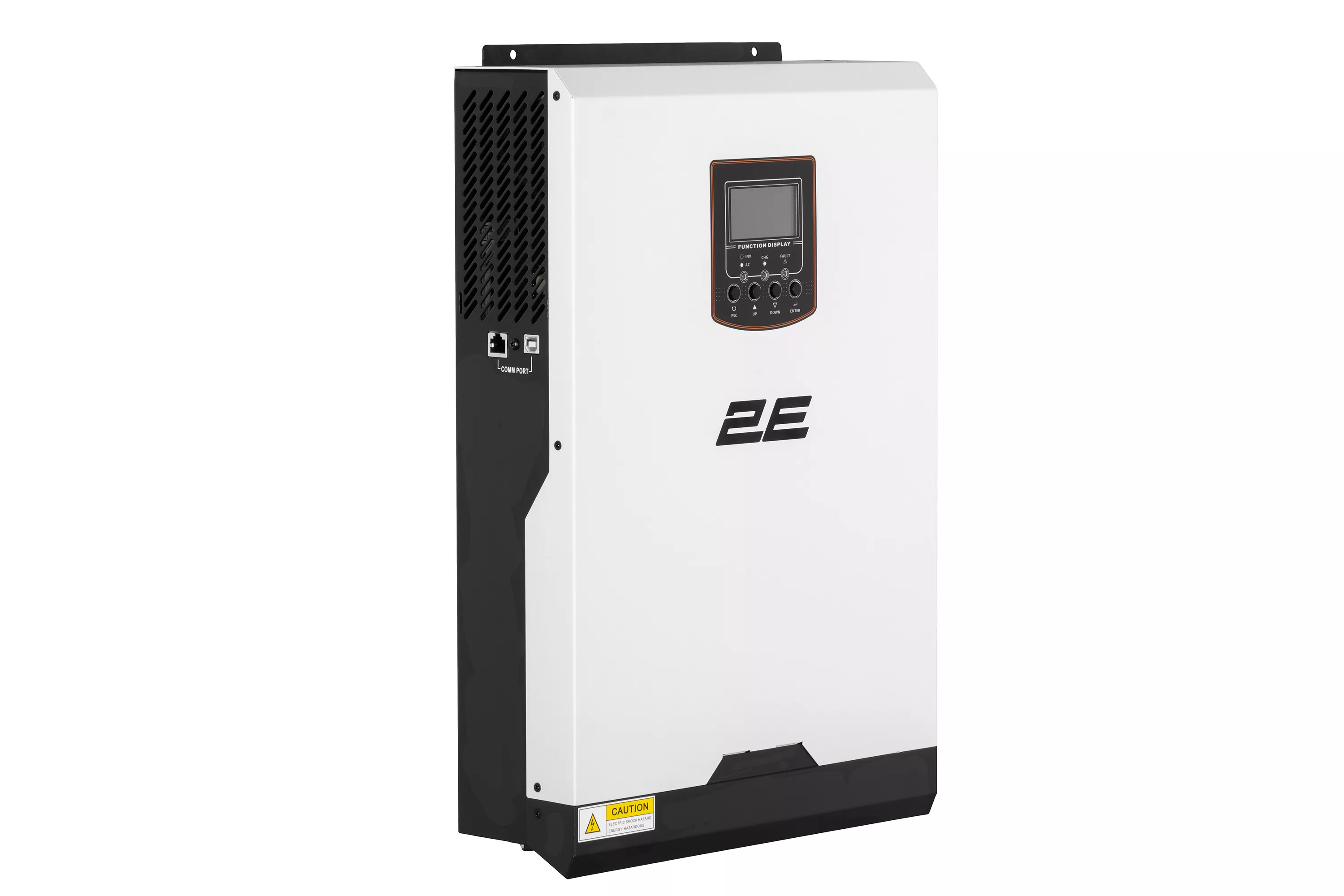 Пятикиловаттный инвертор 2E VM-5K48 при габаритах 440 × 300 × 100 мм весит 8,5 кг. Модель оснащена встроенными сетевым и солнечным ЗУ, устройство допустимо подключать к массиву солнечных панелей общей мощностью до 3000 Вт. Окно MPPT: 60-115 В (пост. тока), Voc –; 145 В (пост. тока), Isc –; 50 A. Батарейная опора инвертора 48 В, при этом максимальный ток для заряжаемого устройства составляет 120 А (комбинированный).