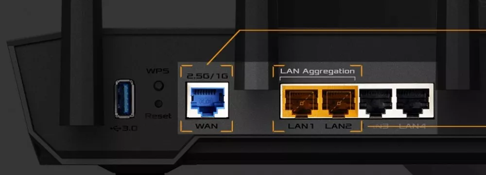 TUF Gaming AX4200 может обеспечить интернет-подключение с пропускной способностью до 2 Гбит/с благодаря наличию WAN-порта 2,5 Гбит/с и возможности объединения двух отдельных каналов по 1 Гбит/с каждый, подключенных к портам LAN1 и LAN2.