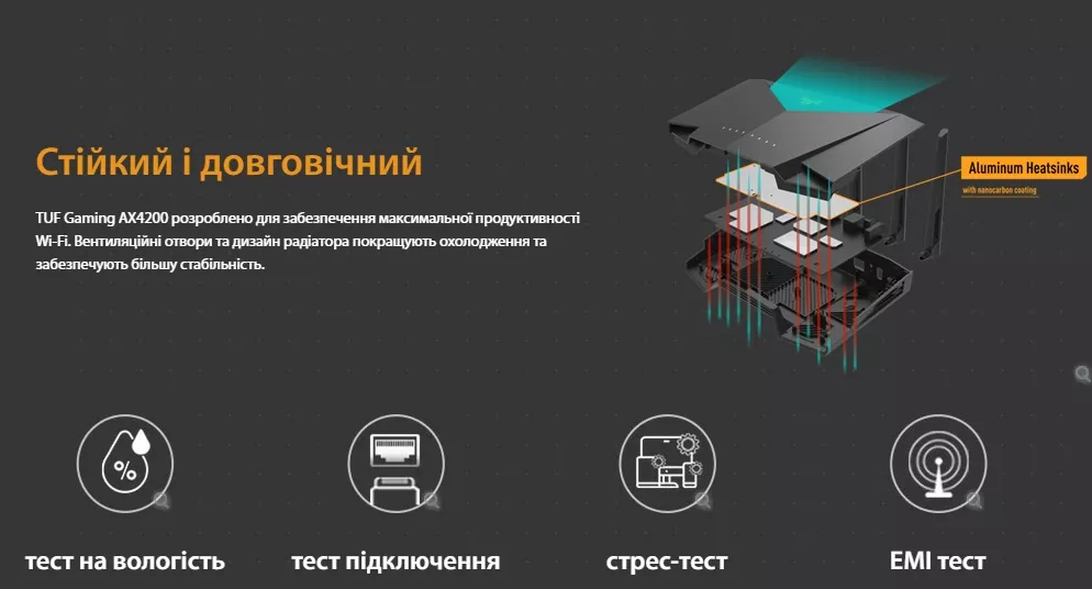 TUF Gaming AX4200 разработан для безупречного функционирования сети Wi-Fi. Продуманное расположение вентиляционных отверстий и радиатор охлаждения способствуют стабильной работе устройства, а фиксированные антенны и металлические защитные кожухи увеличивают его долговечность.