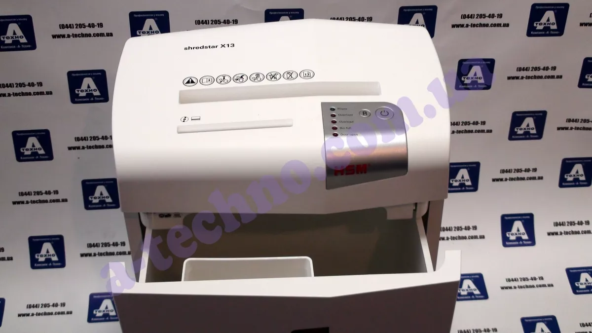 Уничтожитель бумаги, шредер HSM shredstar X13 (4x37). Перекрестная резка: 4х37мм; Уровень секретности: 4; Уничтожает за раз: 15 листов; Ширина реза: 230мм; Уничтожает пластиковые карточки, CD; Объем корзины: 23л; Габариты: 390x300x595мм; HSM, Германия