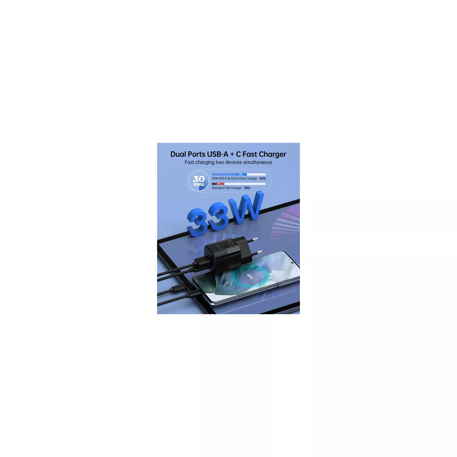 Двух портовое зарядное устройство Choetech мощностью 33 Вт на 59% меньше по размеру, чем зарядное устройство Apple, без ущерба для его производительности и возможностей быстрой зарядки. Быстрая зарядка двух устройств одновременно, включая ноутбуки и планшеты. Особенности: Выходная мощность 33 Вт. С общей выходной мощностью до 33 Вт это настенное зарядное устройство с двумя портами USB-A и USB-C интеллектуально идентифицирует ваши устройства и обеспечит быстрый и эффективный выходной ток - 33 Вт для порта USB-C, 30 Вт для порта USB-A.<
