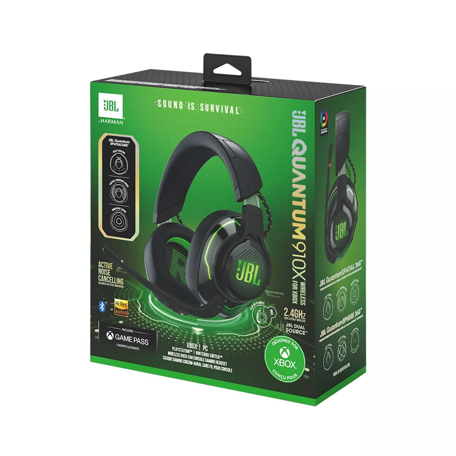 Беспроводная гарнитура JBL Quantum 910X Wireless для Xbox совместима с Xbox™, ПК, PlayStation™ (PS5 и PS4) и Nintendo Switch™, Mac беспроводным соединением 2,4 ГГц, с устройствами, совместимыми с Bluetooth по Bluetooth 5.2 и с ПК, PlayStation, Xbox, Nintendo Switch, Mobile, Mac и VR через аудиоразъем 3,5 мм. Функции JBL QuantumENGINE (JBL QuantumSURROUND, RGB, EQ, микрофон и т.д.) доступны только на компьютере. Проверьте совместимость в руководстве по подключению.