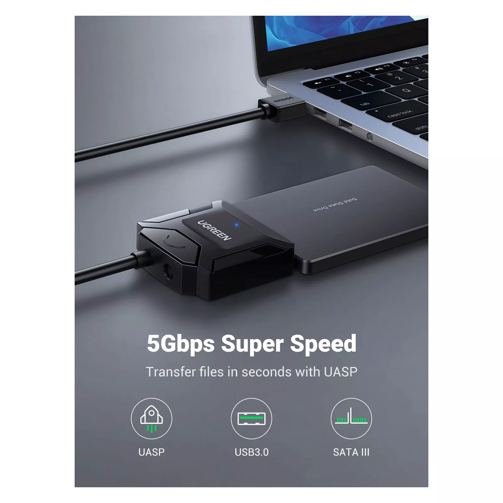 Адаптер USB 3.0 Ugreen для дисков с разъемом SATA позволяет подсоединять жесткие диски 2.5" и 3,5" к компьютеру. компьютера через высокоскоростной USB 3.0 Применяемый современный чипсет гарантирует высокую скорость передачи данных, надежность и безопасность. Это продукт Plug&Play, что означает, что он не нуждается в каких-либо драйверах для правильной работы.