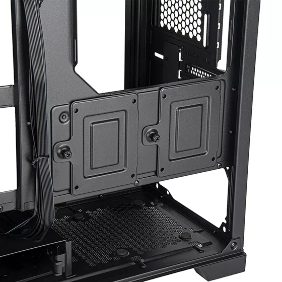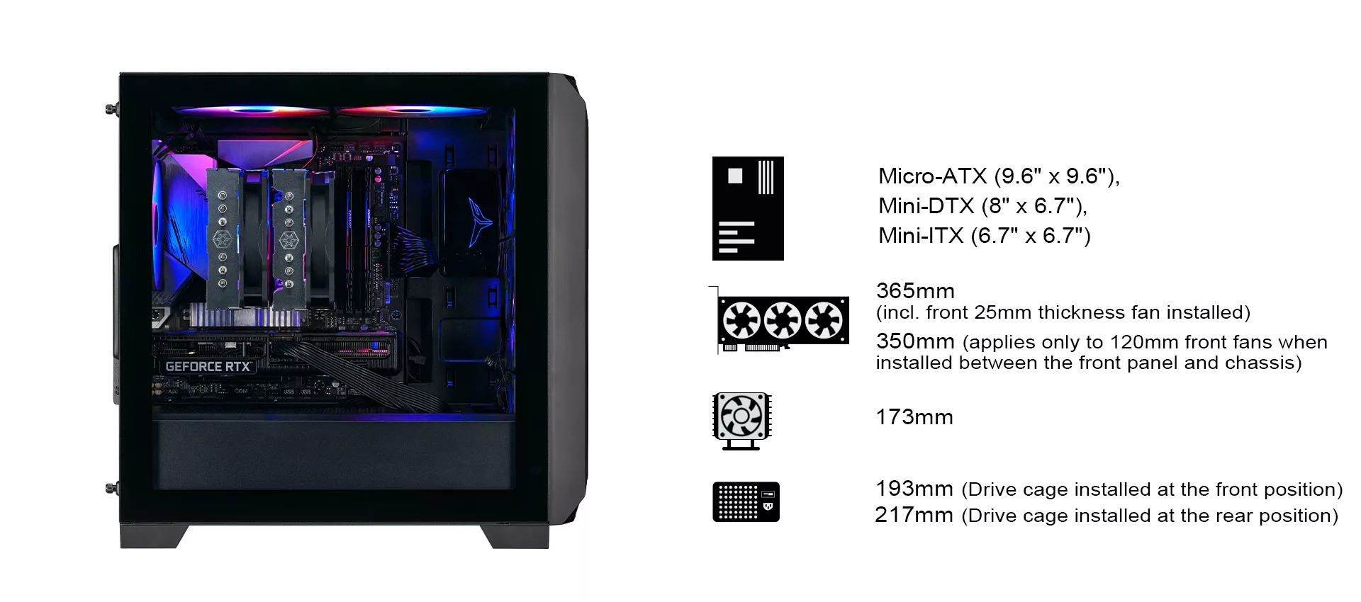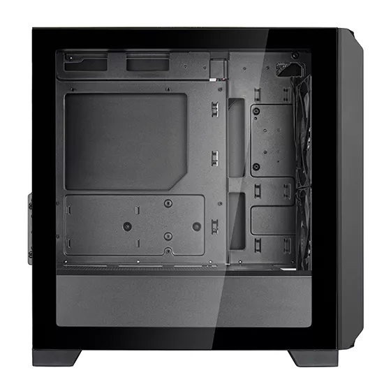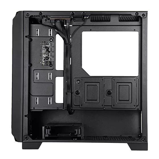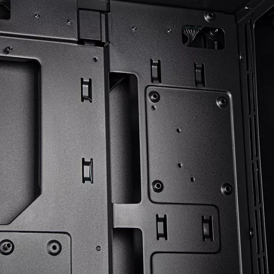 Точно спроектированный интерьер обеспечивает достаточное пространство для производительной видеокарты и нескольких вариантов охлаждения. В корпус можно разместить два 3.5" или 2.5" дюймовый накопитель. Одновременно может быть установлен только один форм-фактор. Корпус рассчитан на блок питания ATX длиной до 170 мм. В наличии 4 слота расширения. Конструкция позволяет установить видеокарты длиной до 365 мм с ограничением ширины до 182 мм при наличии вентилятора толщиной 25 мм на передней панели. Корпус отличается вместительным интерьером и совместим по параметрам с современными комплектующими. Аккуратная, удобная компоновка и размещение кабелей в корпусе благодаря продуманному кабелю менеджмента.