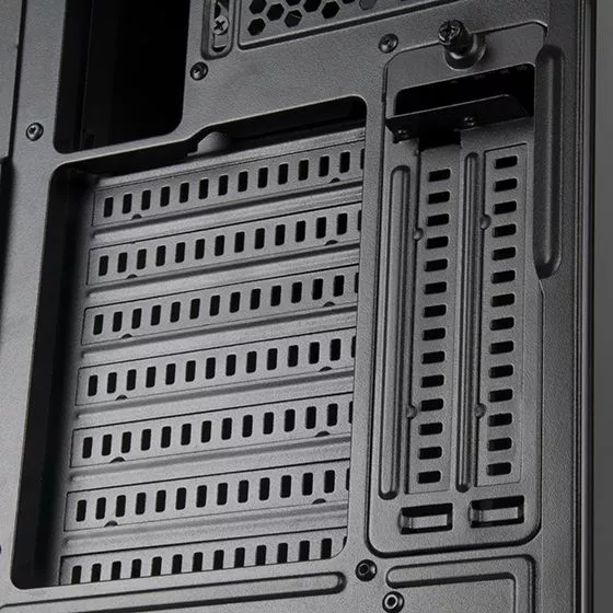 Точно спроектированный интерьер обеспечивает достаточное пространство для производительной видеокарты и нескольких вариантов охлаждения. В корпусе можно установить по два 3.5" дюймовых и 2.5" дюймовый накопитель в различных комбинациях, стандартный ATX блок питания длиной до 200 мм. В наличии 7+2 слота расширения. Конструкция корпуса позволяет устанавливать видеокарту длиной до 340 мм. Корпус отличается достаточно просторным интерьером. Аккуратная, удобная компоновка и размещение кабелей в корпусе благодаря продуманному кабелю менеджмента.