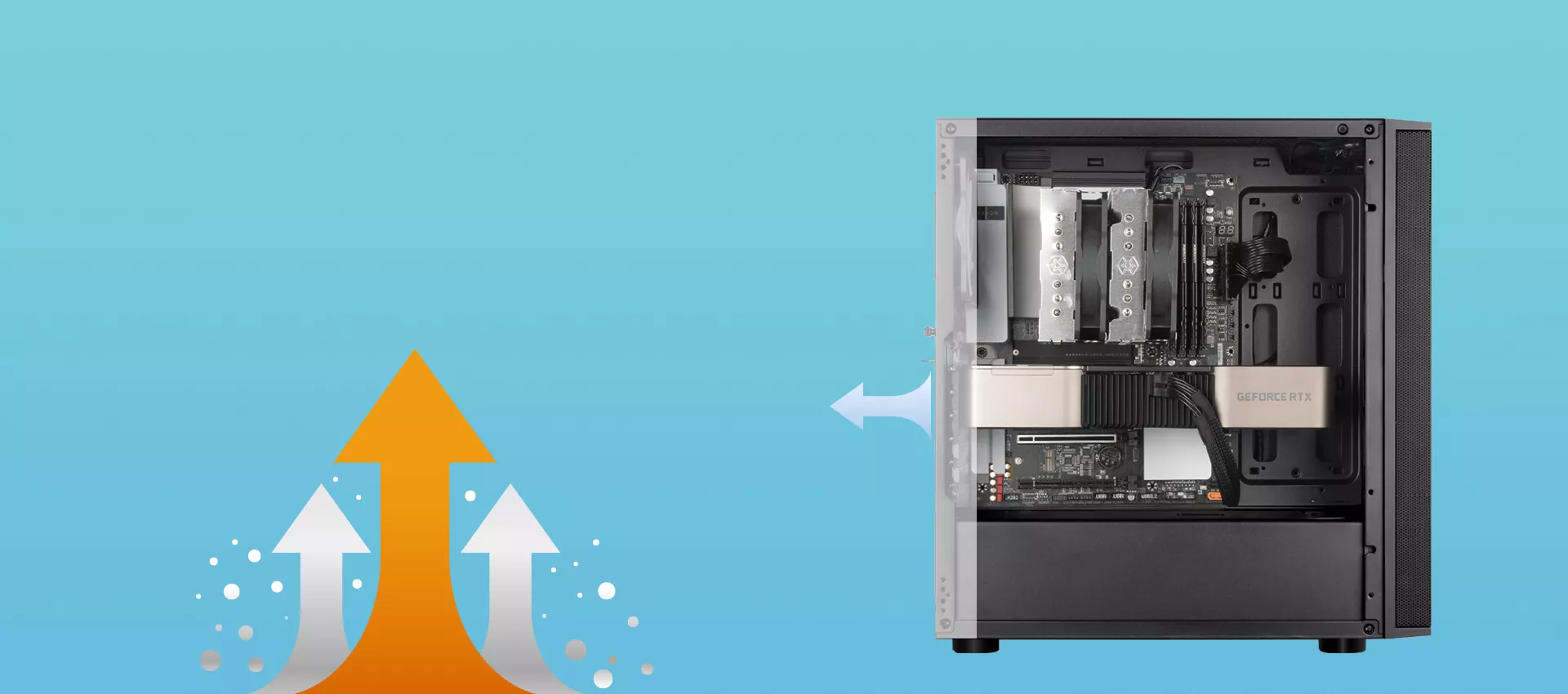 В комплекте четыре установленных 120мм ARGB тихих вентилятора: три штуки на передней панели – на вдув и один на задней панели, работающий на выдув. Забор воздуха благополучно производится через металлическую сетку на передней панели. Потока достаточно для охлаждения компонентов системы разного уровня.