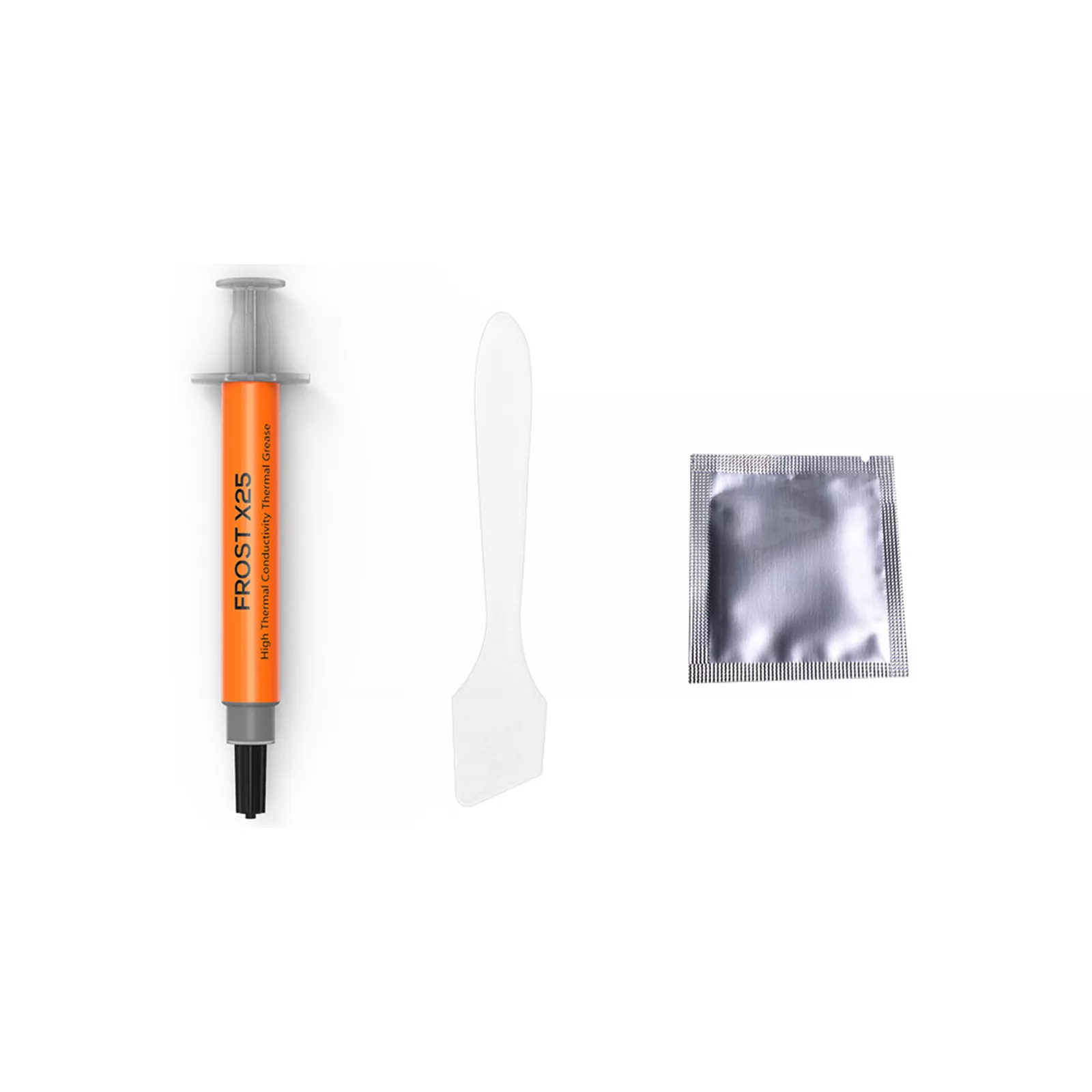 Термопаста ID-Cooling Frost X25 благодаря теплопроводности на уровне значения 10,5 Вт/мК обеспечивает высокую эффективность рассеяния тепла и охлаждения мощных аппаратных компонентов. Она способна выдерживать температуру нагрева в пределах 180 °C и изготовлена из безопасных материалов, не производящих электрический ток. Для удобства нанесения и распределения термопаста ID-Cooling Frost X25 поставляется в шприце. Также в комплекте предусмотрены салфетка для обезжиривания поверхности и аппликатор.