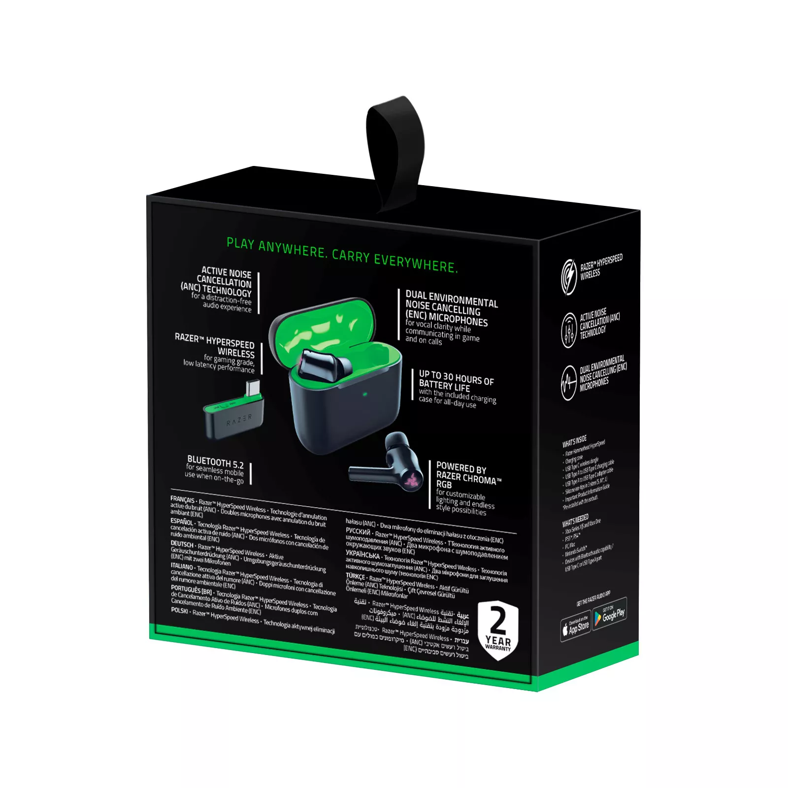 Играйте в полном комфорте с Razer Hammerhead HyperSpeed. Это беспроводные игровые наушники, которые обеспечивают безграничную свободу и позволяют погрузиться в звук, не отвлекаясь. С подходящей для игр беспроводной связью на частоте 2.4 ГГц и поддержкой Bluetooth 5.2 вы сможете играть где угодно и носить их с собой везде. с низкой задержкой сигнала. Благодаря сверхскоростному беспроводному подключению на частоте 2.4 ГГц с помощью прилагаемого донгла USB-C эти наушники воспроизводят звук непрерывно и с низкой задержкой, позволяя играть на соревновательном уровне на самых разных платформах. .