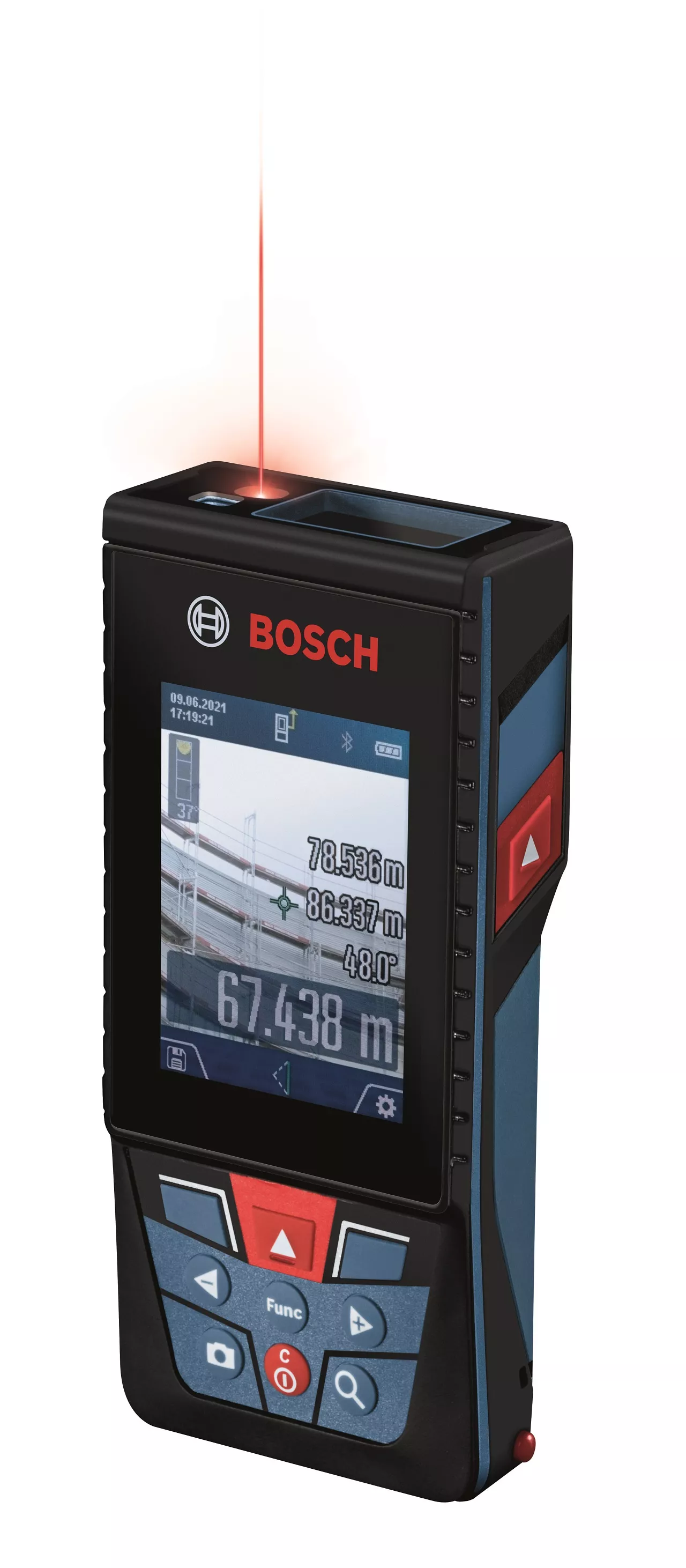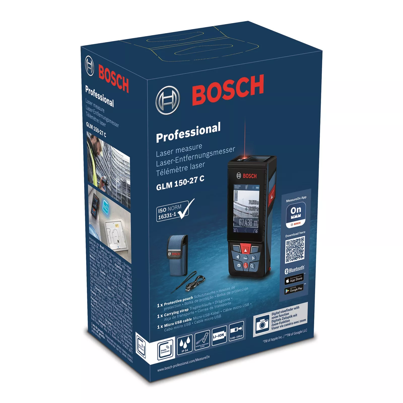 Для удобства документирования все данные можно передавать через Bluetooth в приложение Bosch MeasureOn App или через USB-соединение на ПК. Благодаря защите IP54, устойчивому к царапинам стекла дисплея и удобному интерфейсу этот лазерный измеритель является удобным универсальным прибором для сложных рабочих мест.