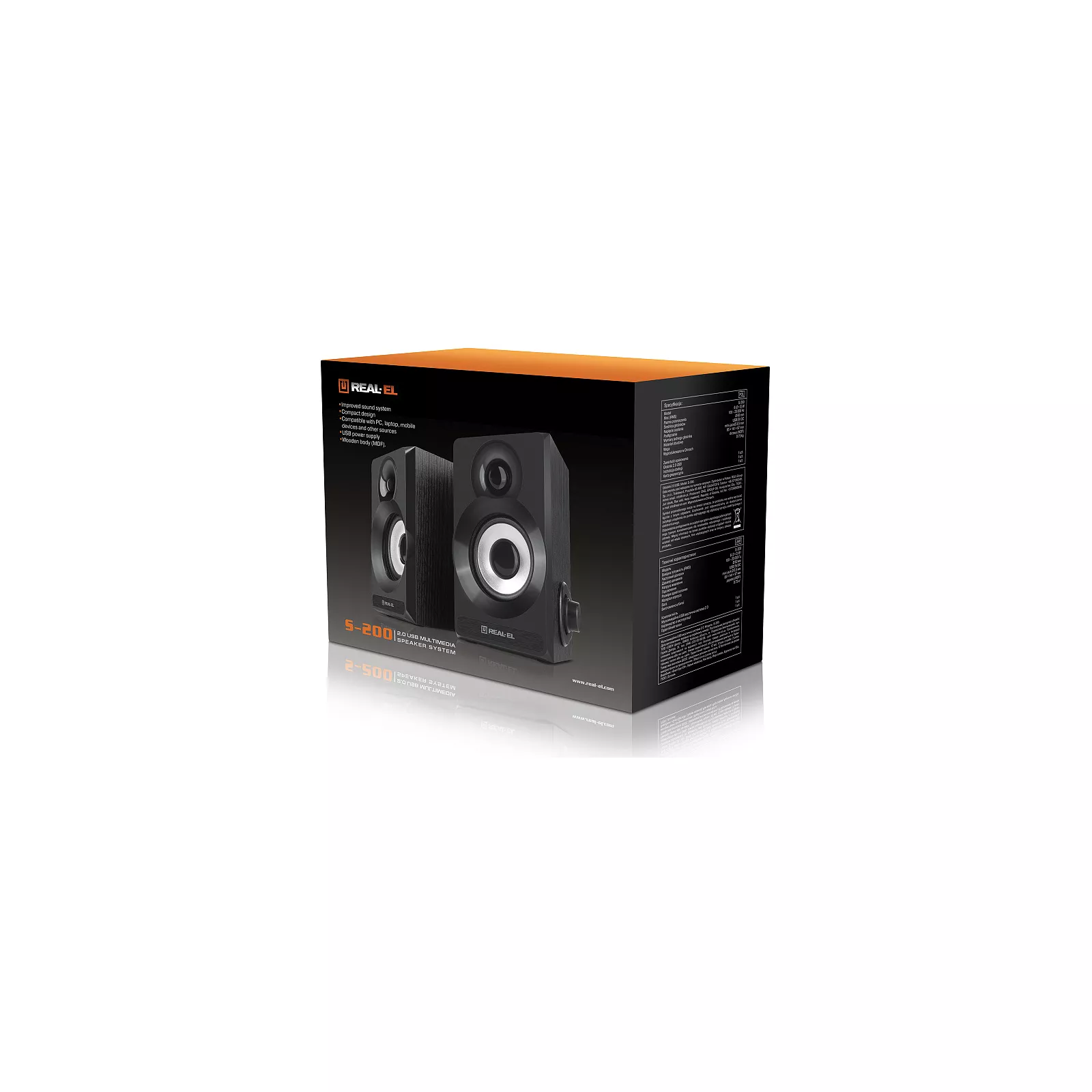 Мультимедийная акустическая система REAL-EL S-200 – легкое и доступное решение вопроса озвучивания компьютера (ноутбука). Питание акустической системы осуществляется через USB-порт ПК, ноутбука или блок 5V DC с помощью встроенного USB-кабеля питания.