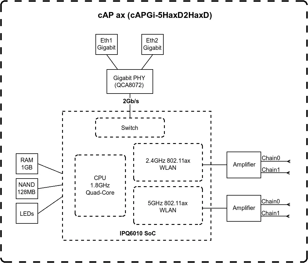 Стандарт беспроводной связи связи Generation6 802.11ax увеличивает скорость до 40% в диапазоне 5 ГГц и до 90% в диапазоне 2,4 ГГц, если сравнивать с предыдущими поколениями! Но что важнее скорости – это стабильность. Наши новейшие устройства AX могут выдерживать даже самые сложные сценарии беспроводных помех, предлагая самый стабильный и бесперебойный сигнал на сегодняшний день! CAP ax оснащена современным четырехъядерным процессором с тактовой частотой 1,8 ГГц, накопителем NAND и гигабайтом оперативной памяти. Достаточно для того, чтобы использовать весь потенциал самого мощного сетевого программного обеспечения на рынке – RouterOS v7! Сложные правила брандмауэра, аппаратное шифрование IPsec, Wireguard, BGP, расширенная маршрутизация или несколько VPN-тоннелей для удаленной работы – cAP ax может все это!