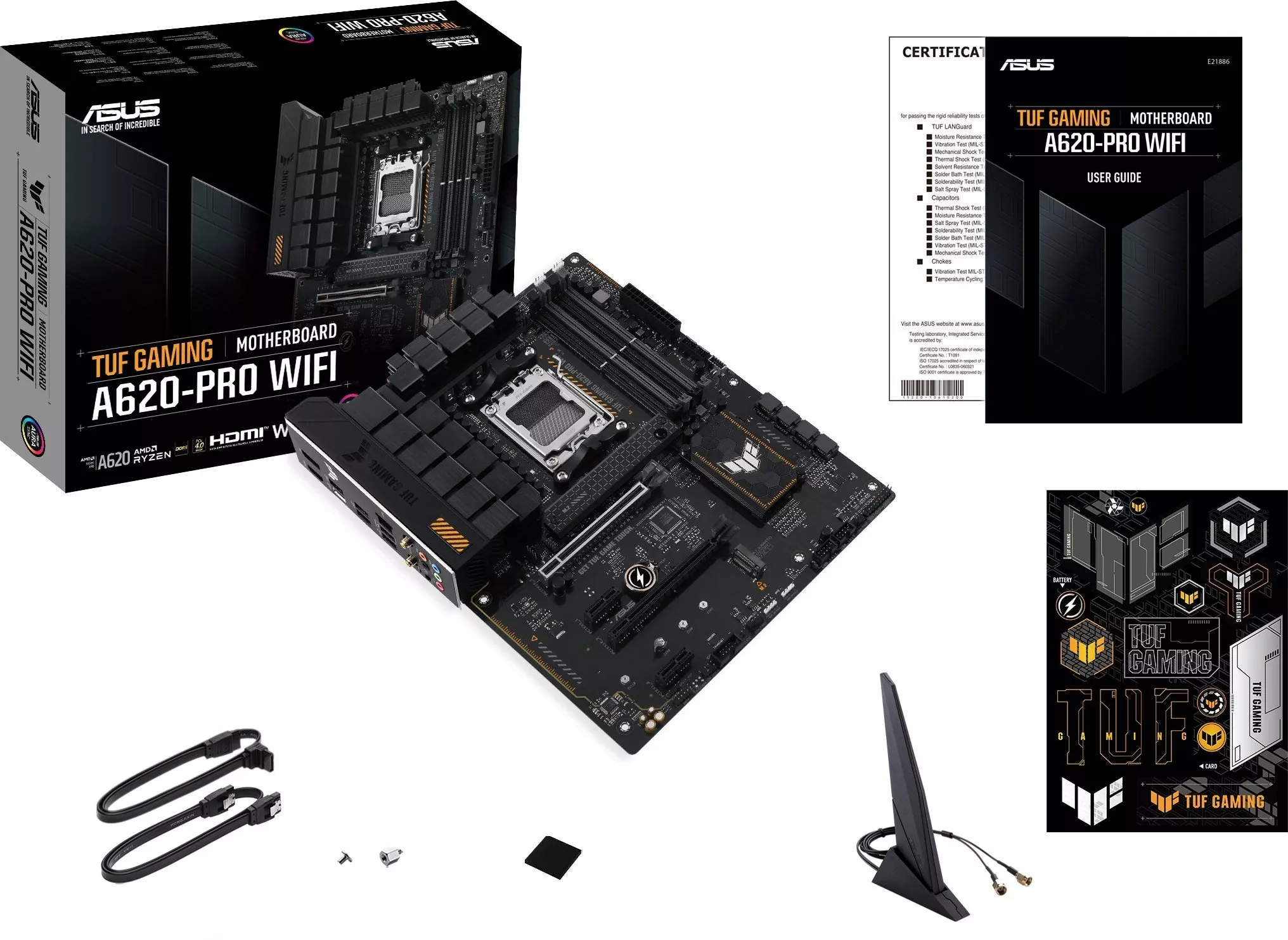 | Комплектация | SATA Cable/x2; M.2 Screw Package; TUF GAMING Sticker; TUF Certification card; User Manual; M.2 Rubber Package; Wi-Fi moving ante |